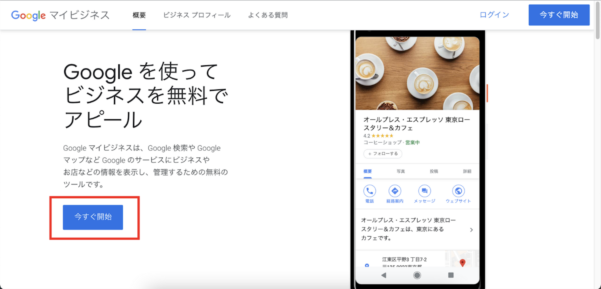 まず、こちらからGoogleマイビジネスにアクセスしてください。