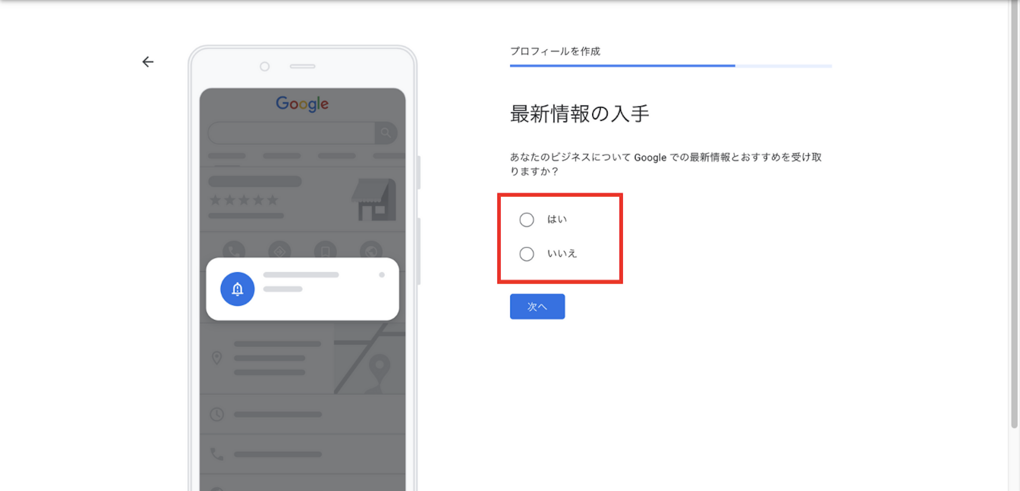 「ビジネス名」と「ビジネスカテゴリ」を入力し、「次へ」をクリックします。