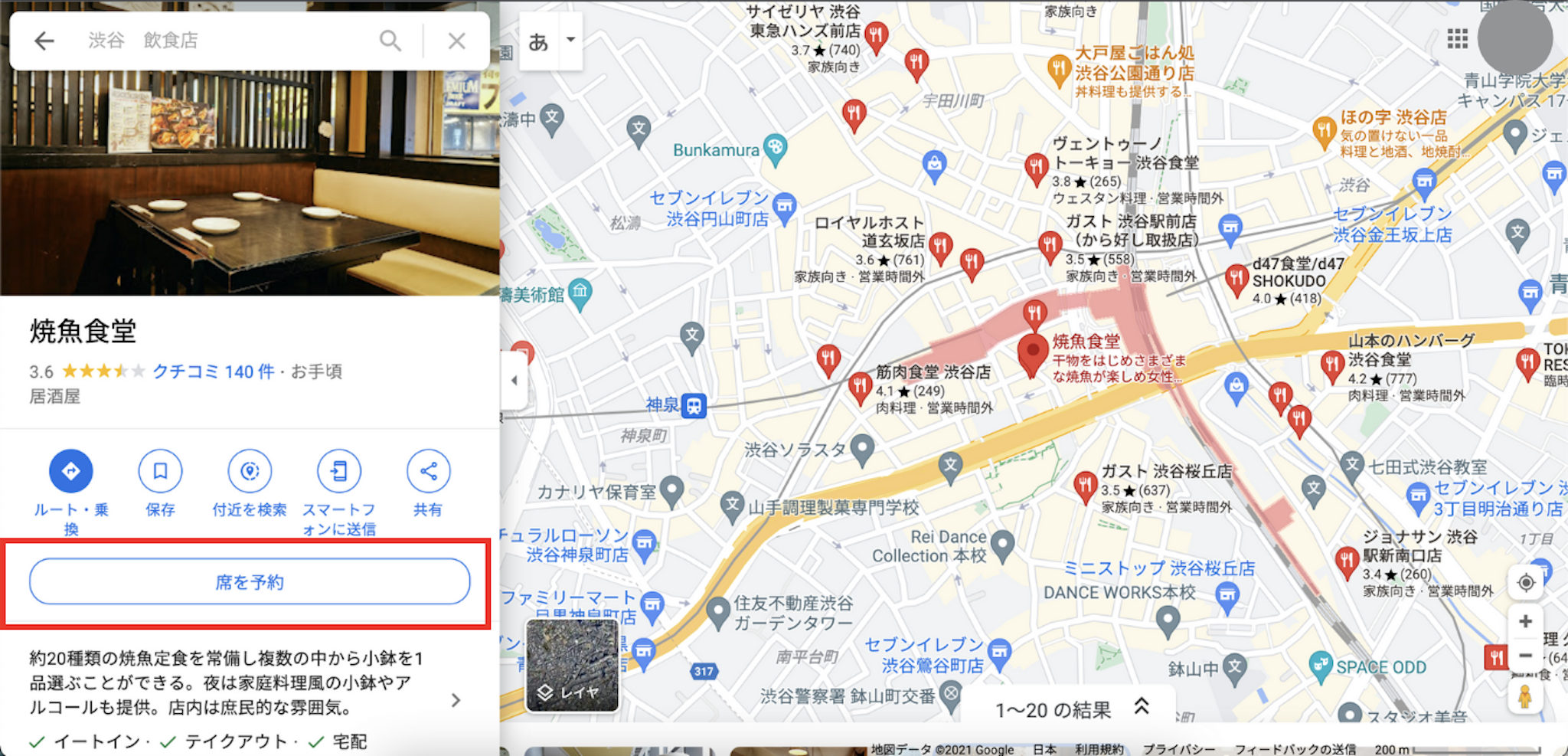 例えば、飲食店を検索したときに、Googleで予約が設定されていれば、下の画像のように、「席を予約」のボタンが表示されています。