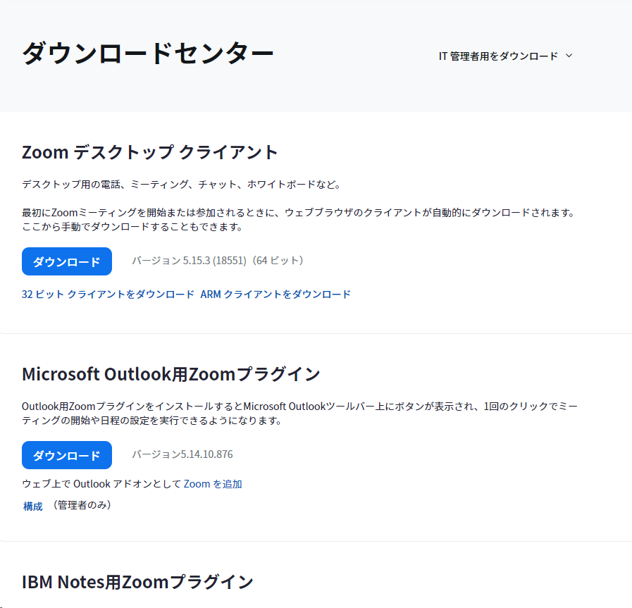 この他、ブラウザとして利用されるGoogle Chrome、Mozilla FirefoxのZoom拡張機能、Zoom Roomsという会議ツールの管理用デバイス用のソフトウェアなどもZoom ダウンロードセンターで配布されています。