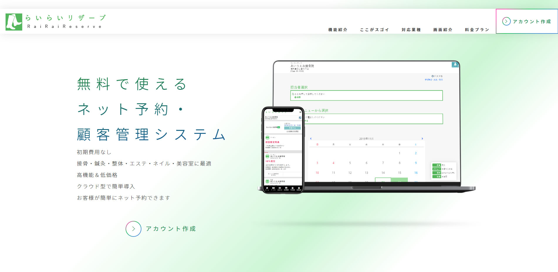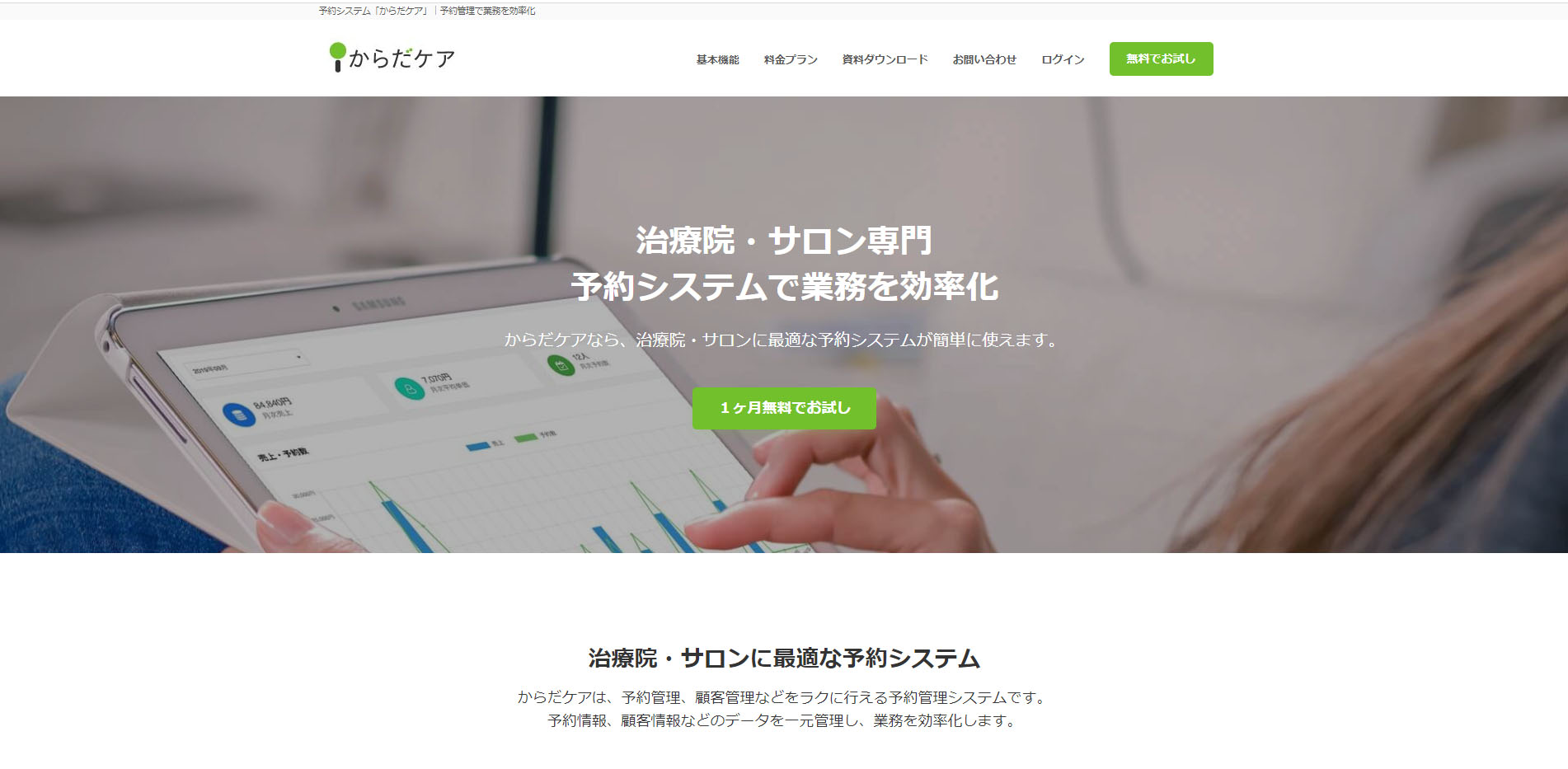 からだケアはシンプルで直感的な操作性が特徴の予約システムです。5分単位での予約管理やスタッフごとに柔軟なメニュー設定が可能など、整体院の予約管理に求められる機能が充実しています。また、集客エリアや売上げの分析機能なども備えています。