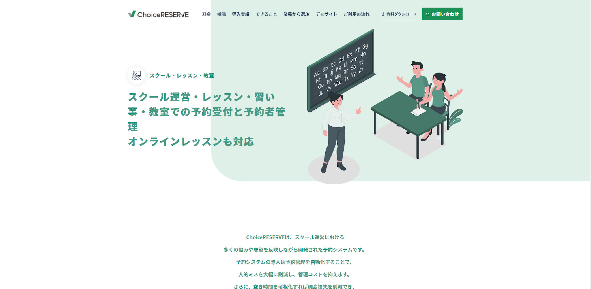 ChoiceRESERVEは空き時間を可視化することで機会損失を削減し、予約管理を自動化することで管理コストの抑制と受講者数のアップが実現できる予約システムです。