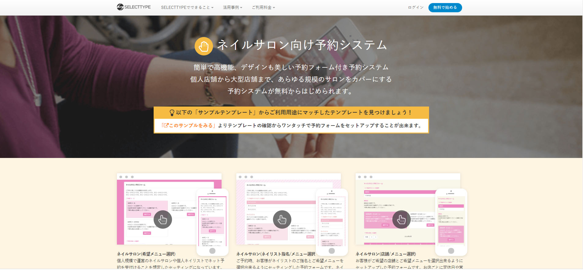 SELECTTYPEは予約管理はもとより、ネイルサロンならではの機能やデザインも展開している予約システムを含んだホームページ制作サービスです。