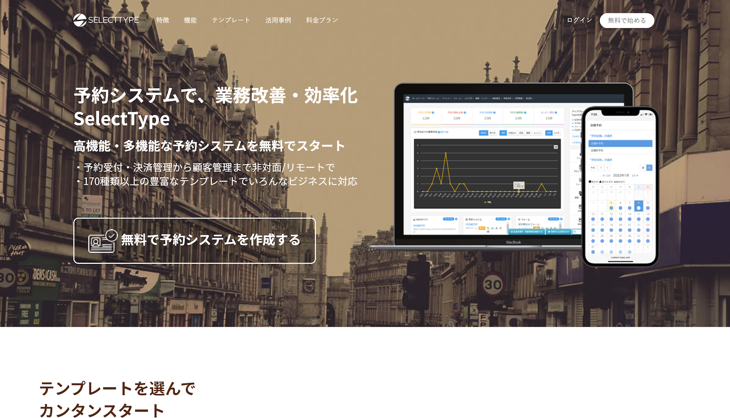 月額1100円のライトプランから予約受付が可能となっており、テンプレートのカスタマイズやSNS連携など幅広い機能を利用することができます。
