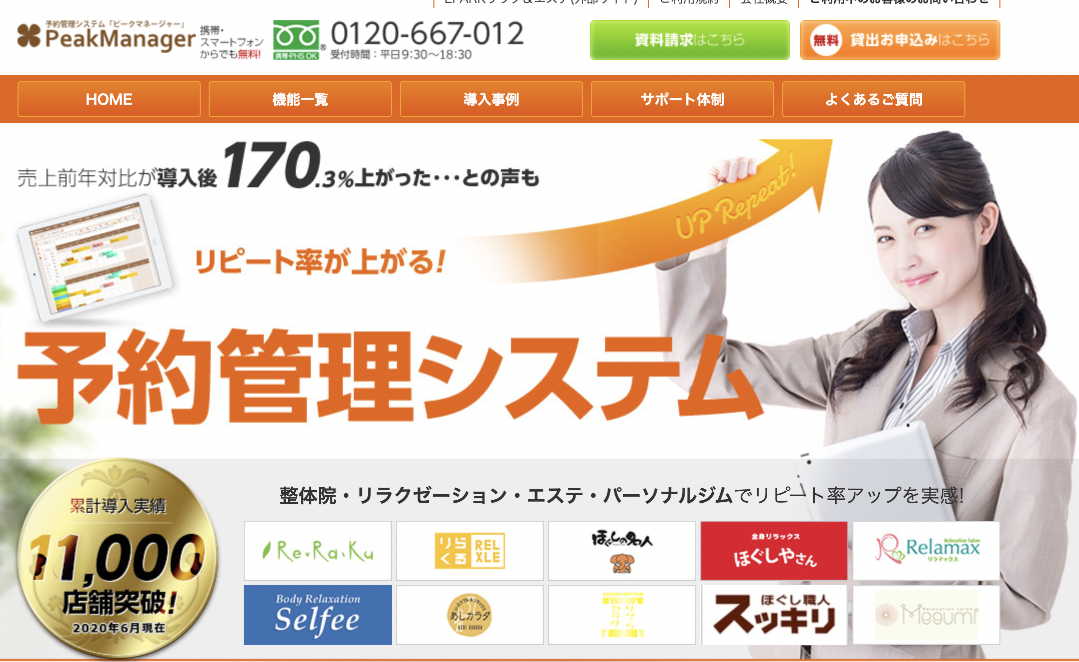 PeakManagerは株式会社EPARKリラク&エステが運営をする整体院・リラクゼーション・エステ・パーソナルジムなど導入実績の多い予約管理システムです。