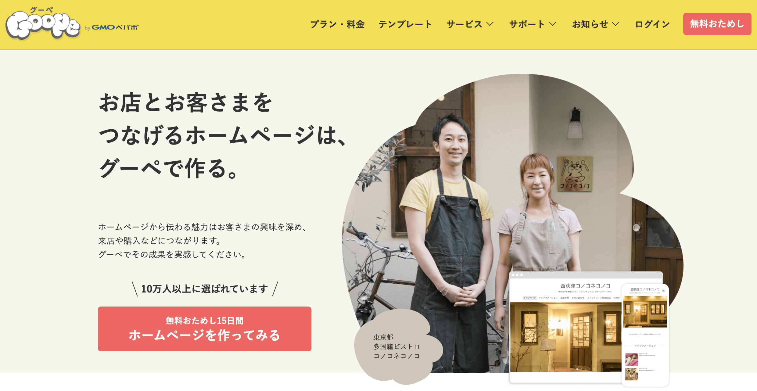 GoopeはGMOペパボ株式会社が運営をする理想のホームページを短時間で完成させることができるホームページ作成ツールです。