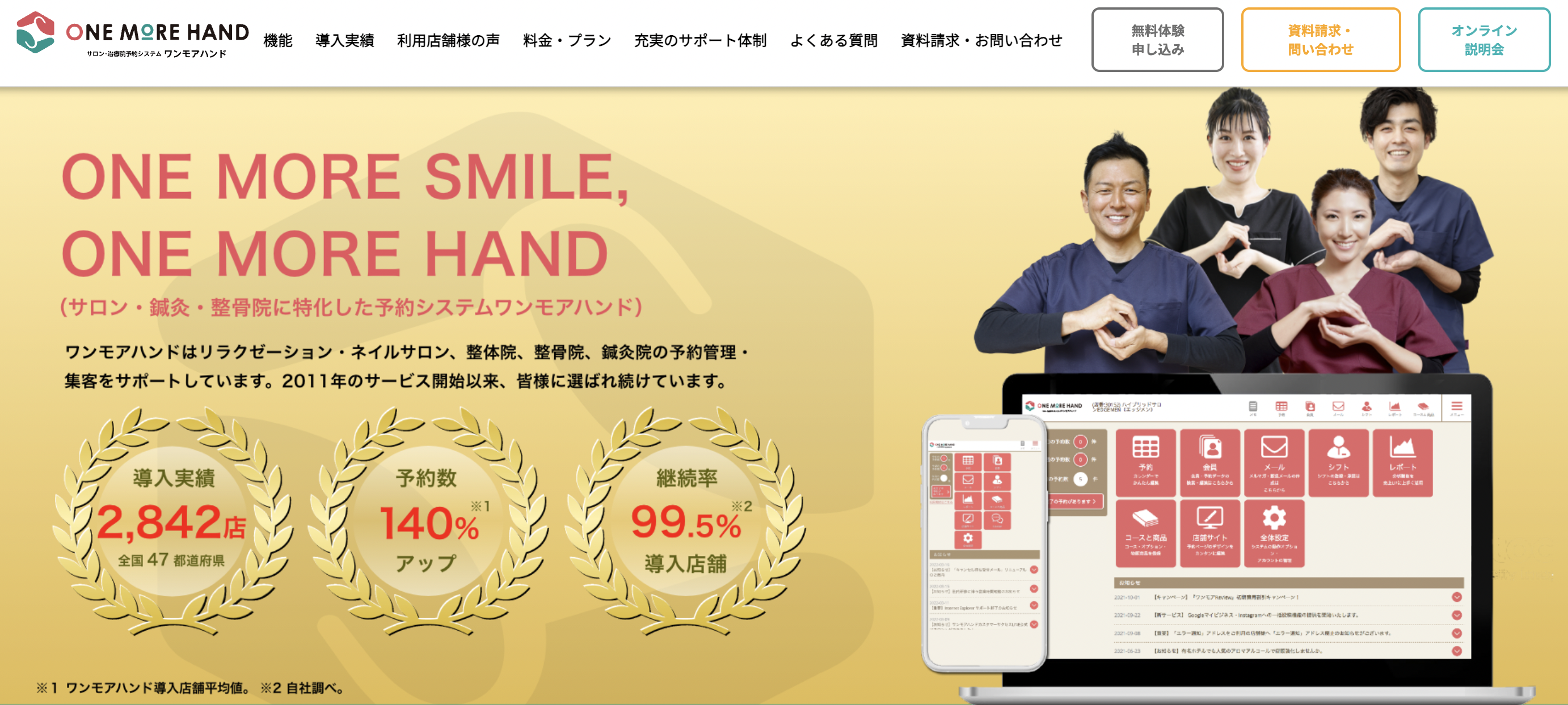 ワンモアハンドは治療院・サロン専門特化型の予約管理システムです。