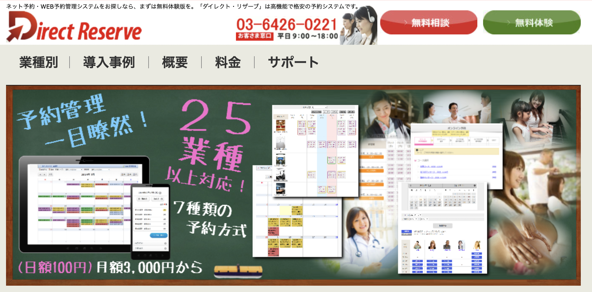 DirectReserveは25業種以上に対応をしている予約管理システムです。