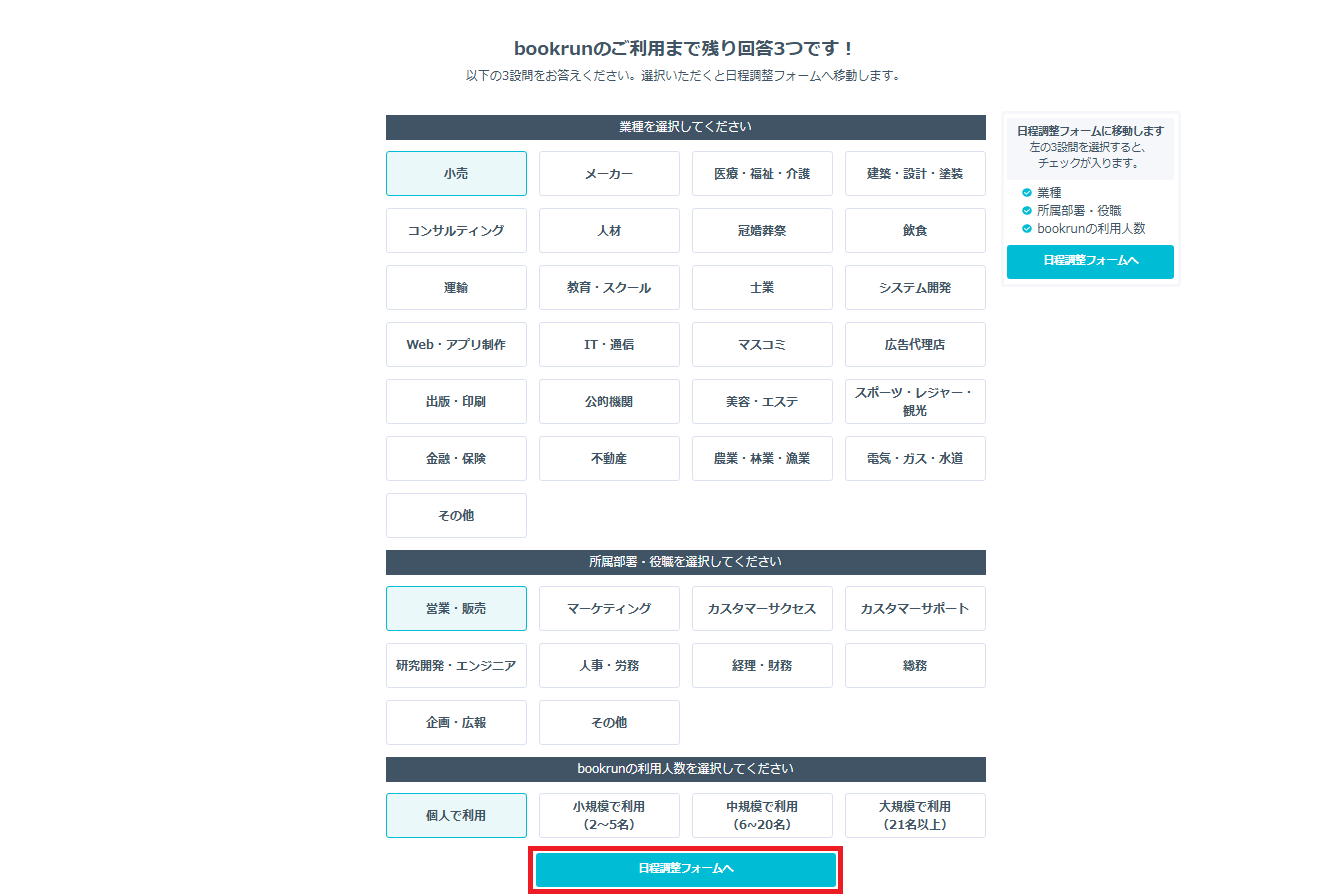 ナビゲーションで業種、所属部署・役職、利用人数を選び、最後に「日程調整フォームへ」を選択します。