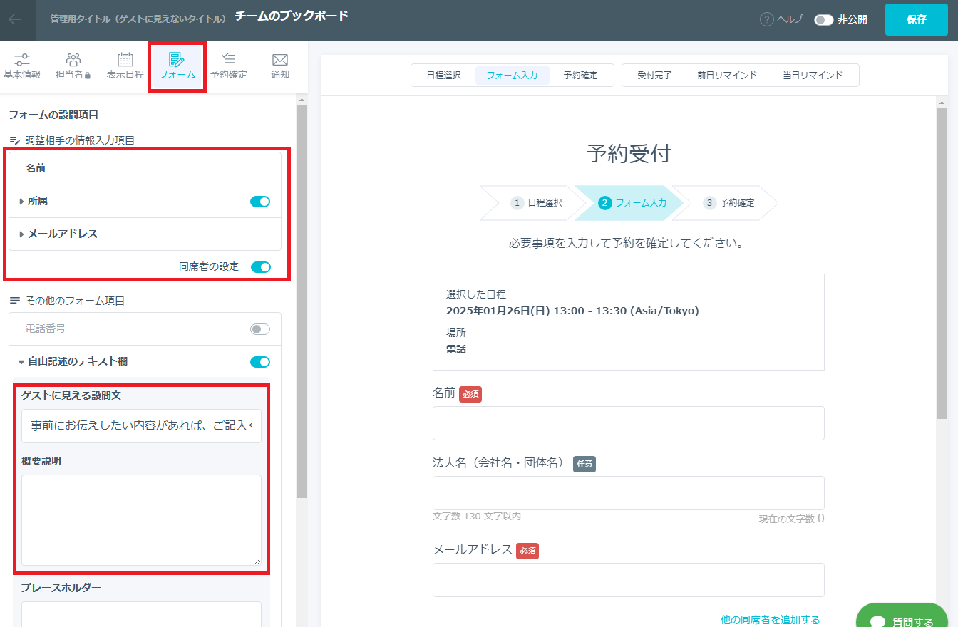 日程調整フォームの完成です。右上の「保存」を選択すると公開され、URLを対象者に配布して日程調整を実施します。