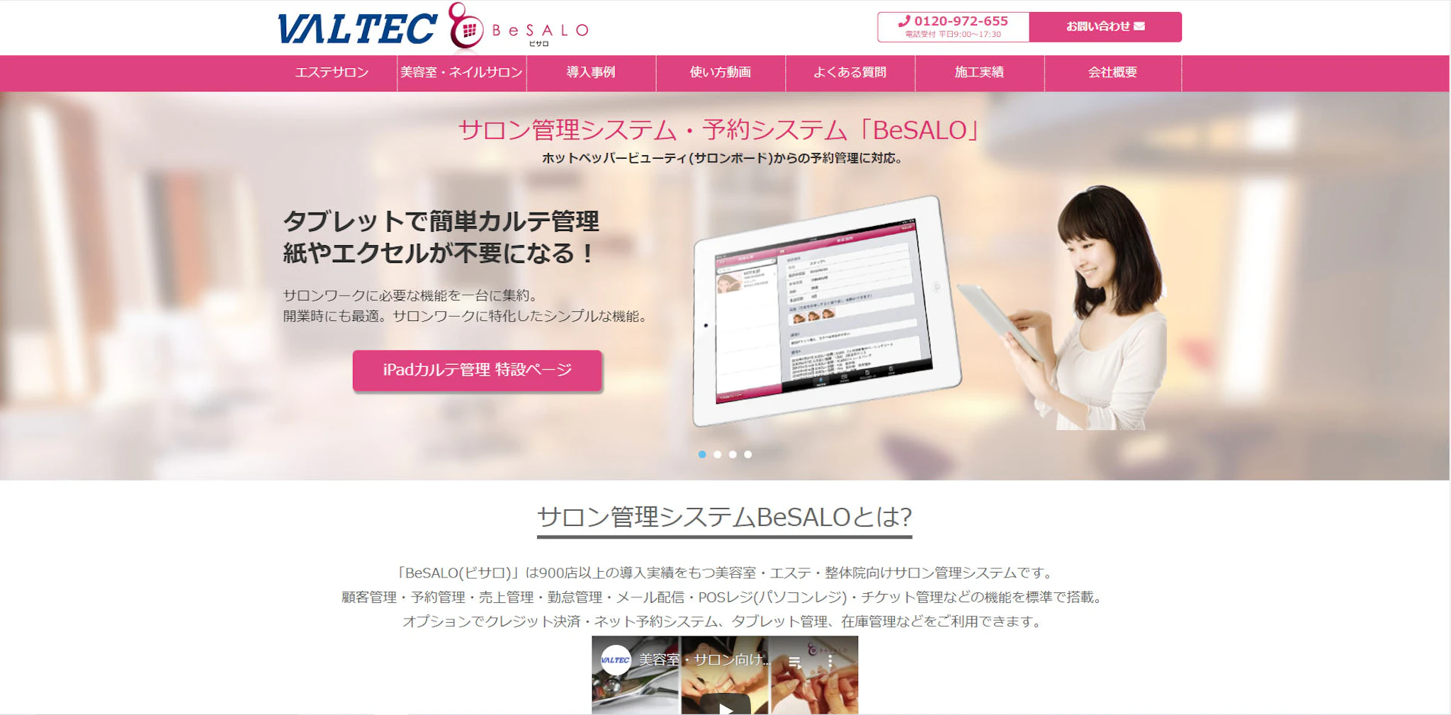 BeSALOはエステサロンをはじめとして900店以上の導入実績をもつ予約システムです。予約管理はもちろん顧客管理、売上管理、勤怠管理、メール配信、さらにPOSレジ(パソコンレジ)、チケット管理などの機能も標準で搭載しています。