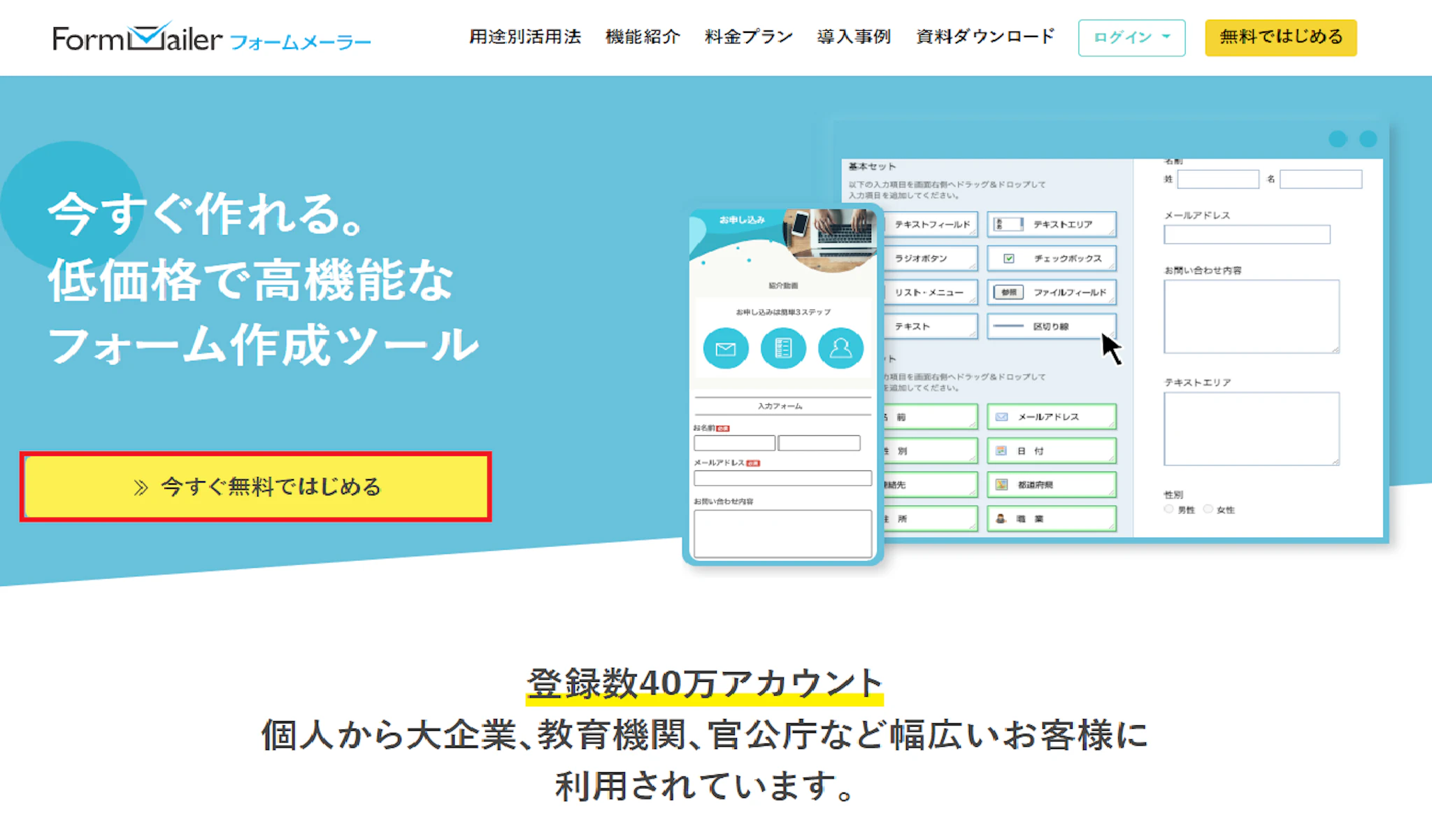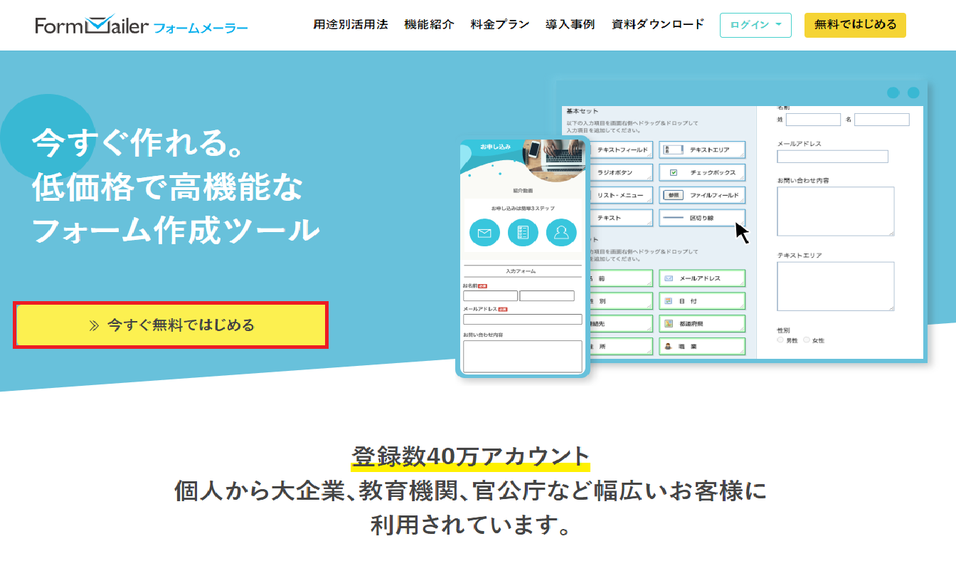 登録アカウント数も40万と多くの方に採用されているフォーム作成ツールです。
