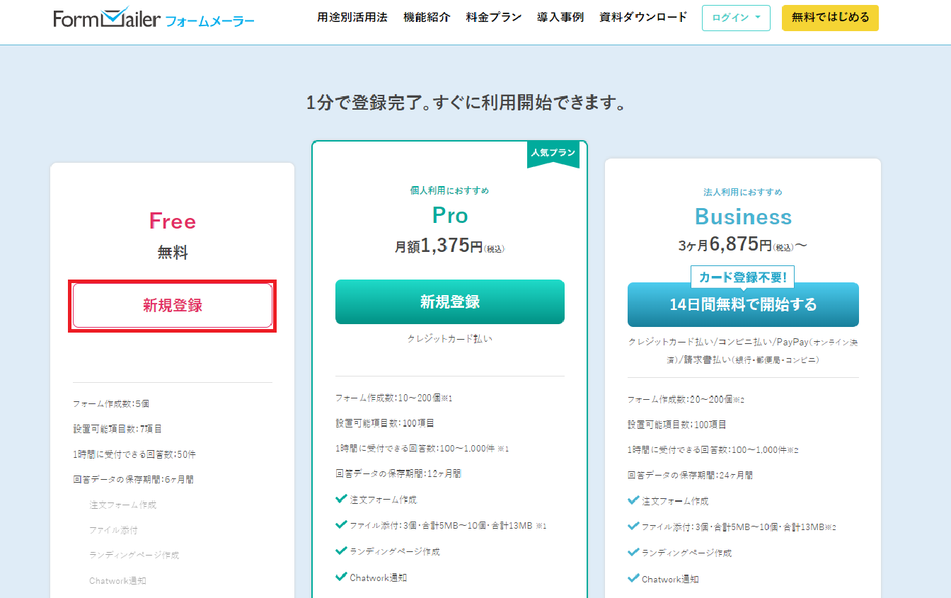 フォームメーラーには、3種類の料金プランがあります。