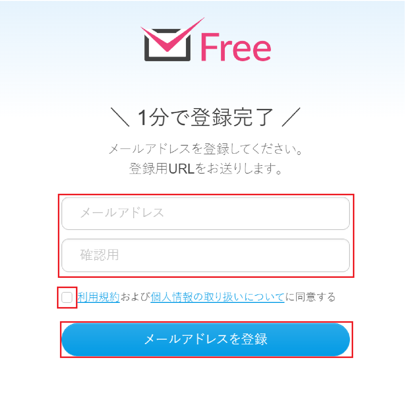 アカウントに使用するメールアドレスを入力し、利用規約・個人情報の取り扱いを確認後、チェックを入れて「メールアドレスを登録」クリックします。
