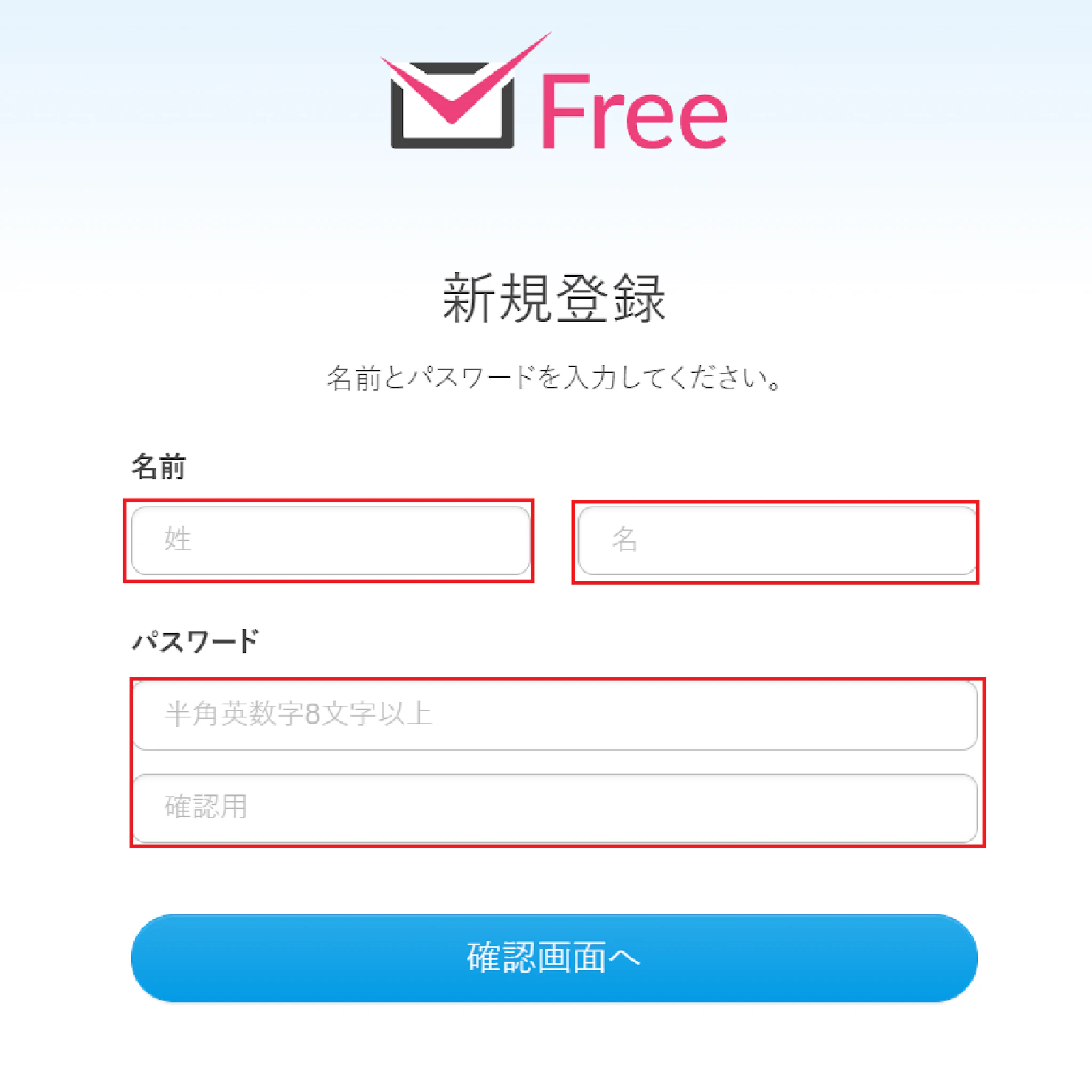 アカウントに使用する名前とパスワードを入力し、「確認画面へ」をクリックします。