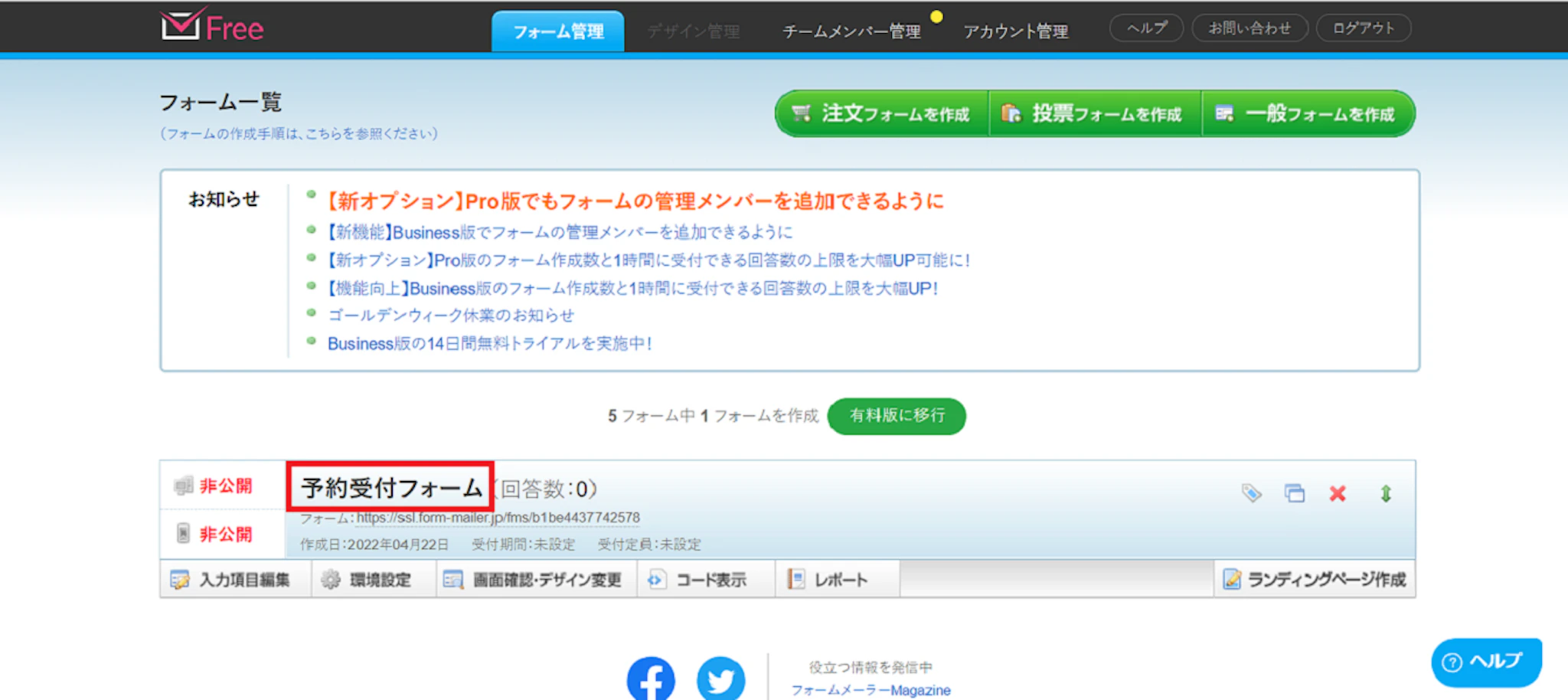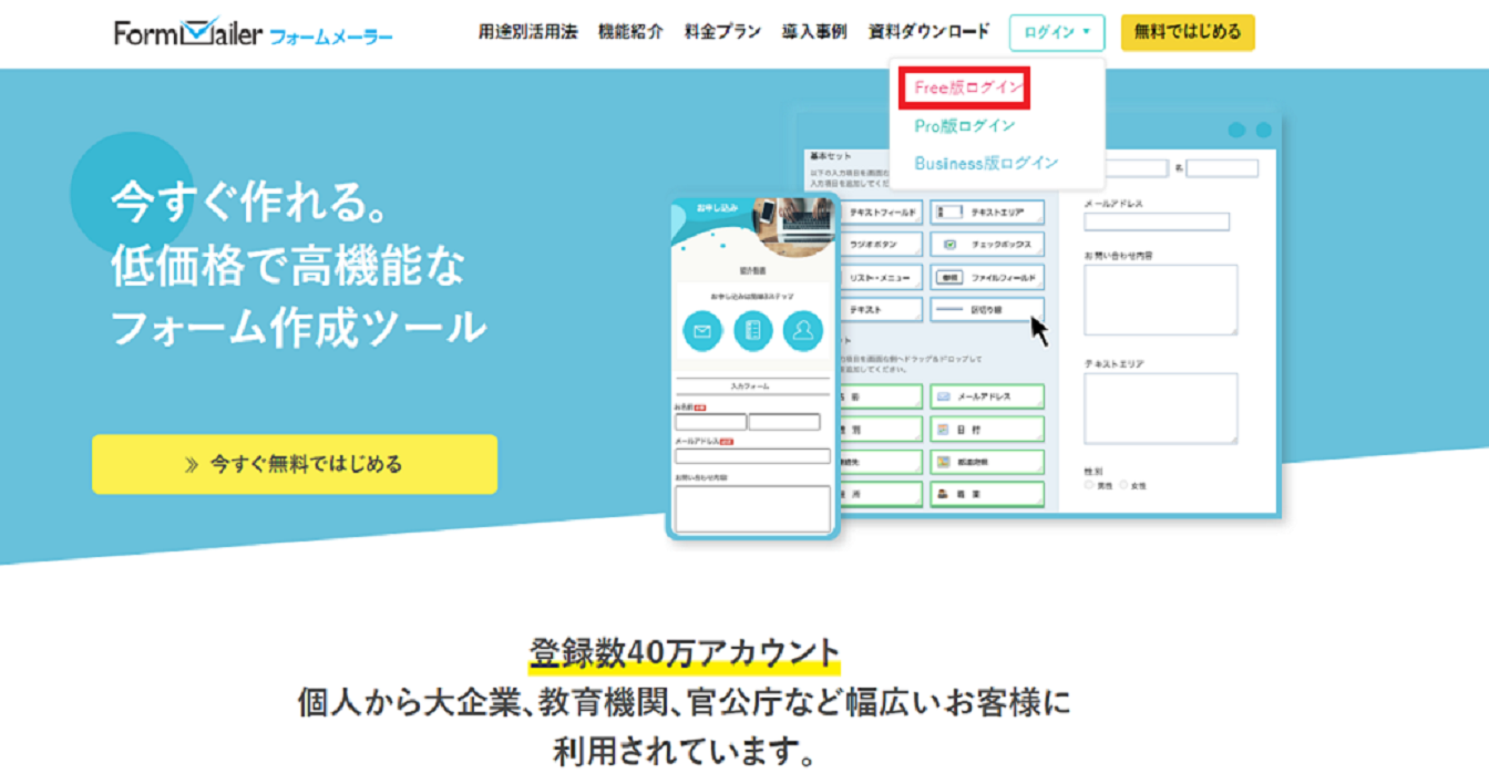 フォームメーラーは無料から始められるフォーム作成ツールです。