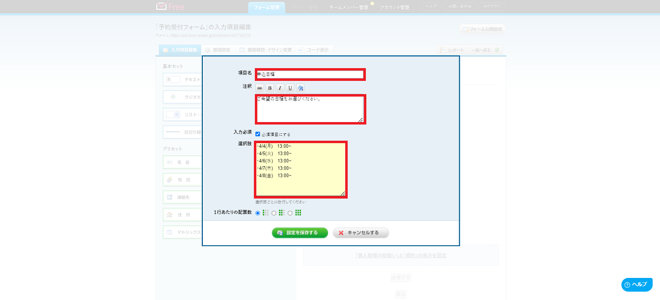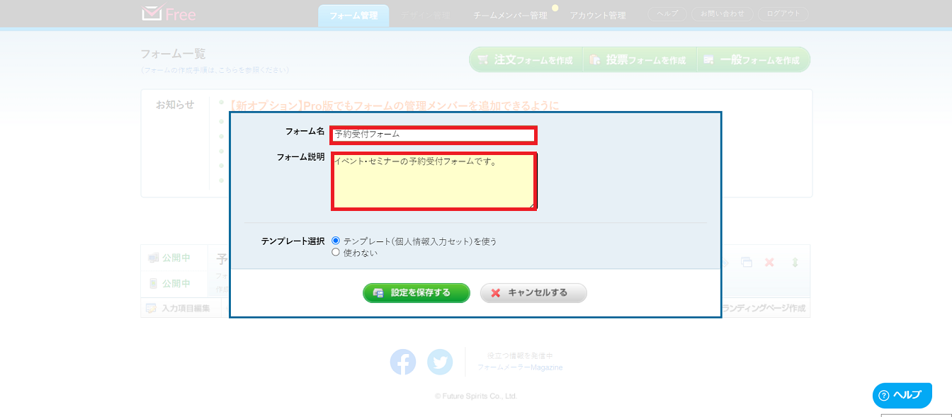 フォーム名とフォーム内容を入力し、「設定を保存する」をクリックします。