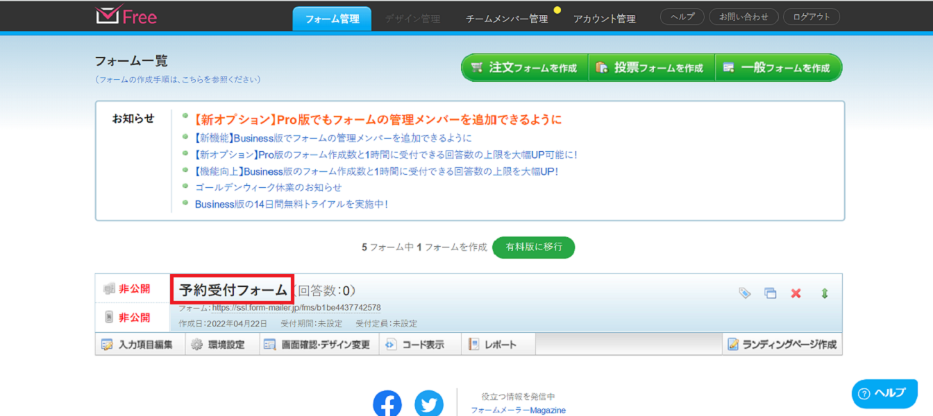登録も簡単で、思い立ったらすぐにフォームを作成することができます。
