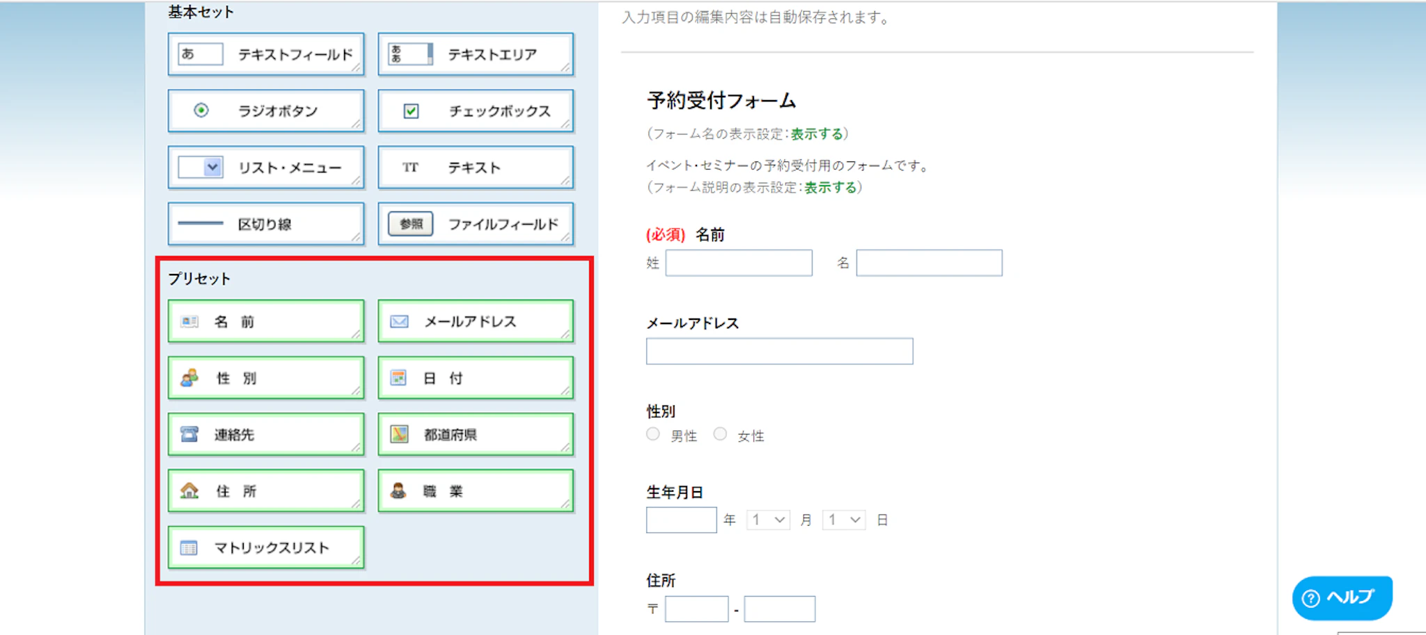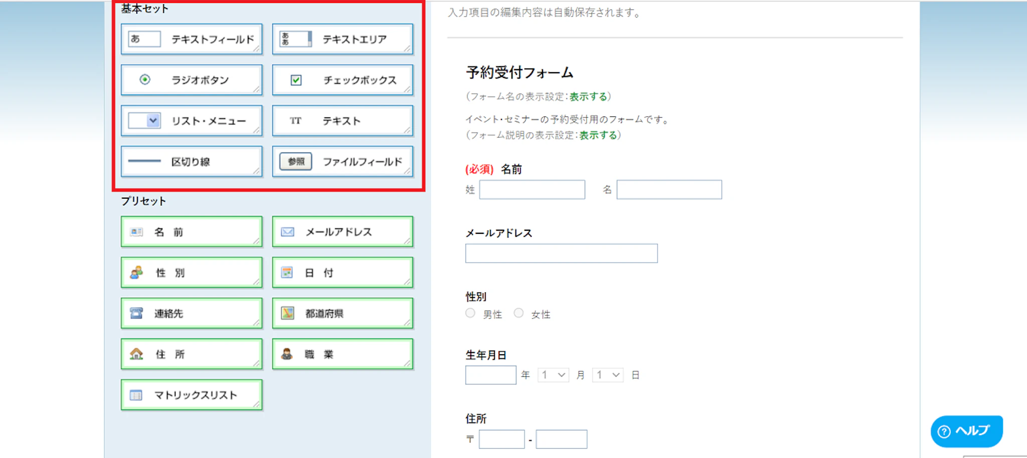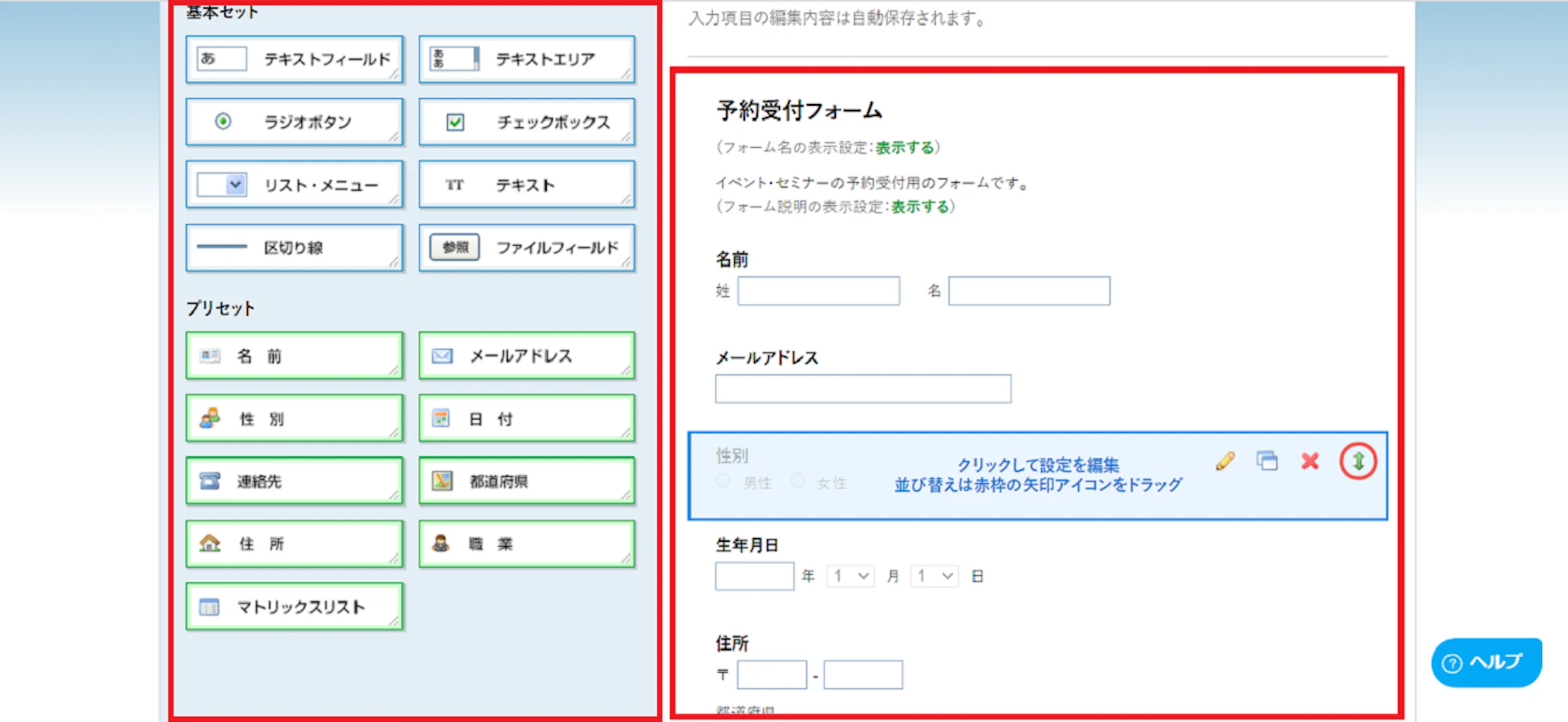 右側がフォームに設置される項目です。(この場合ですと名前・メールアドレス・性別等)