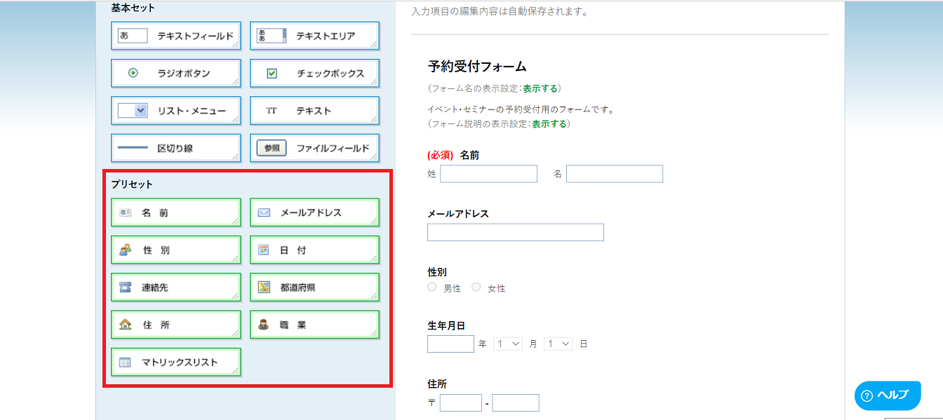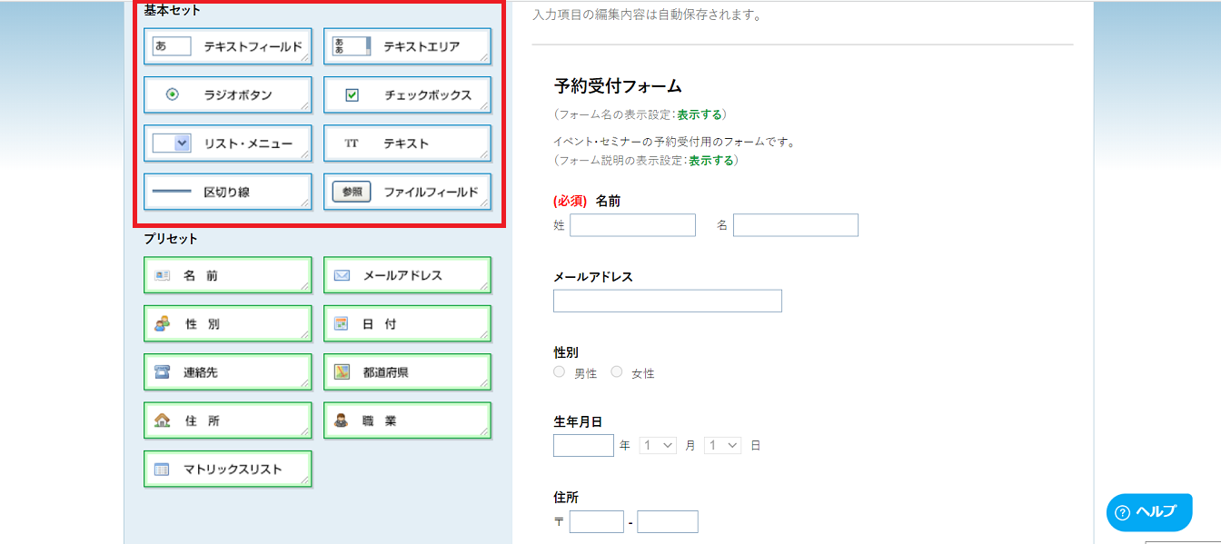 基本的な型があり、ドラック&ドロップでフォーム作成できるので、プログラミングの知識がない方でも問題なく利用できます。