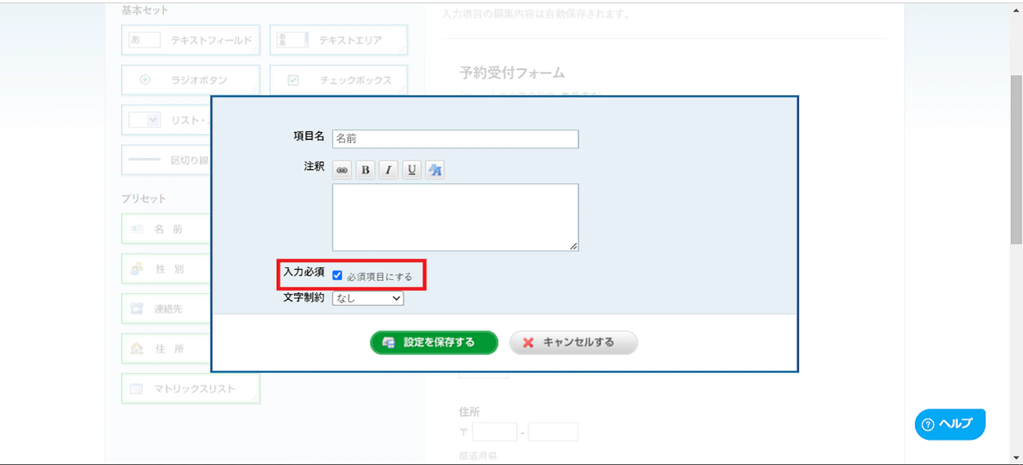 こちらの画面でフォームに設置する項目の編集をします。