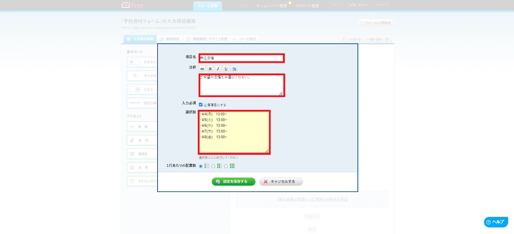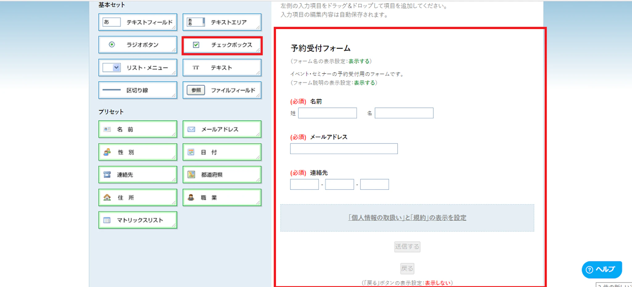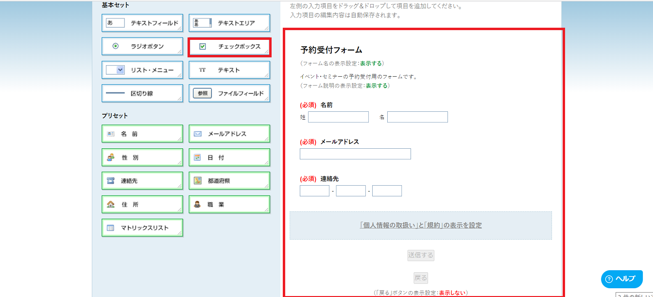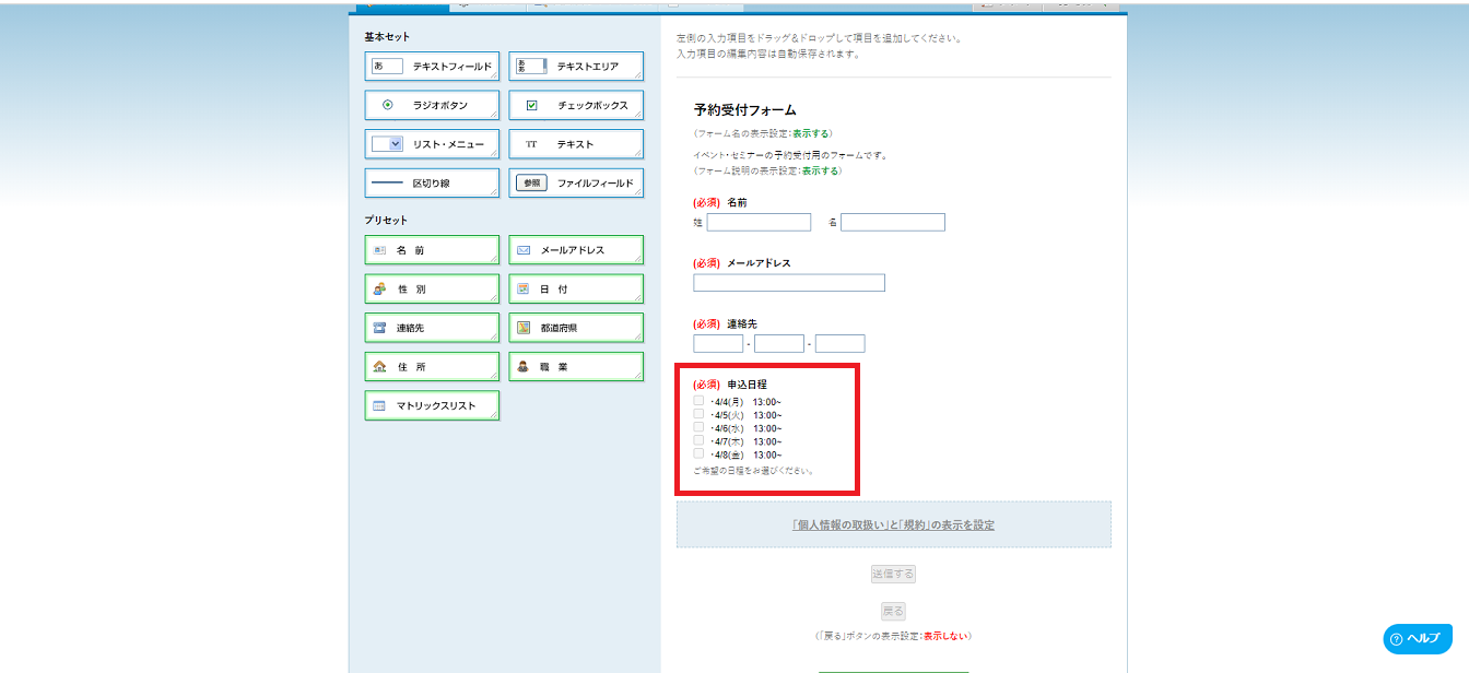 また予約受付には、申込日程も必要なケースが多いため、左のチェックボックスの項目を右側にドラック&ドロップしてフォームに反映させます。