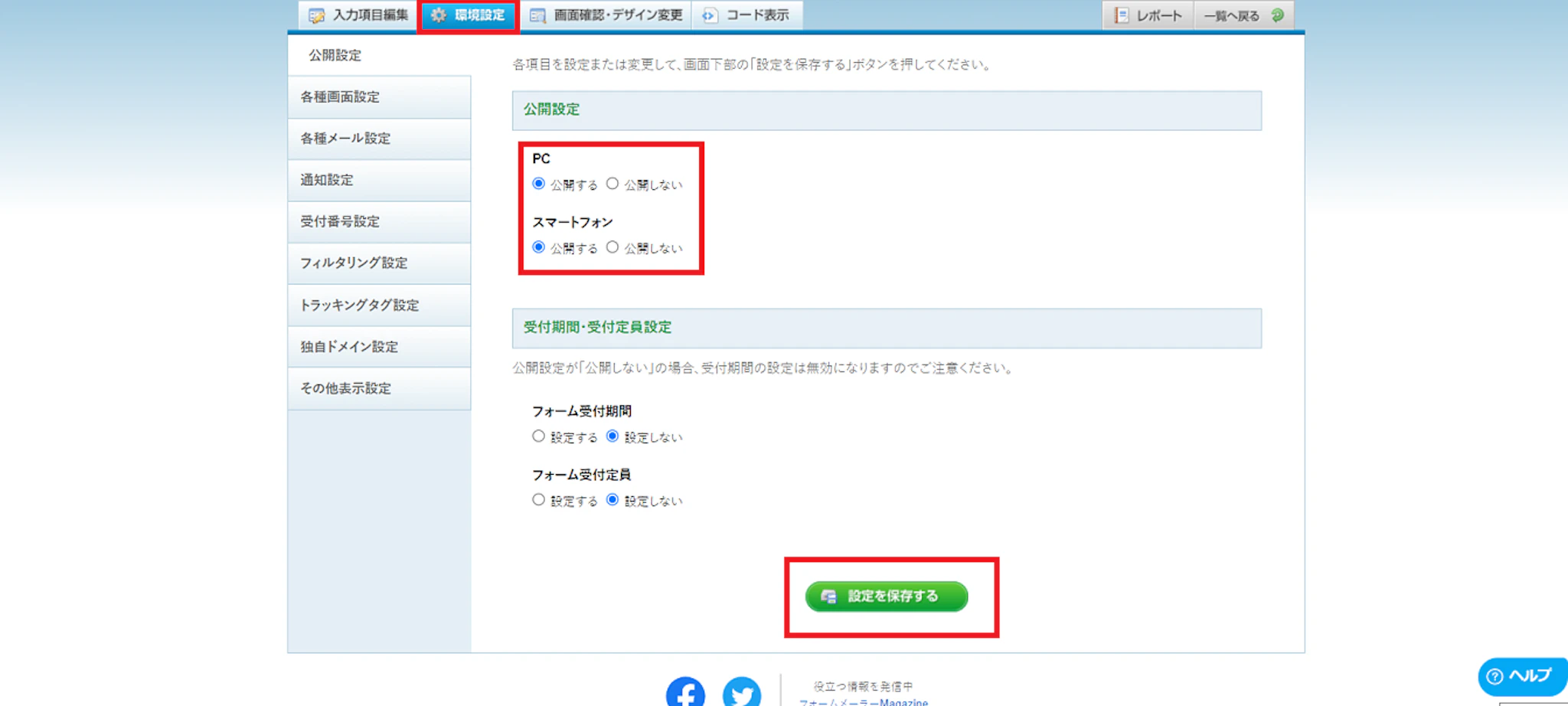 画面上部の環境設定の項目をクリックし、公開設定を行います。