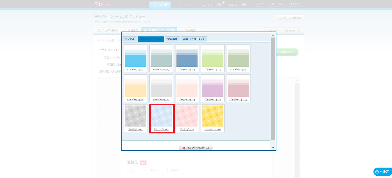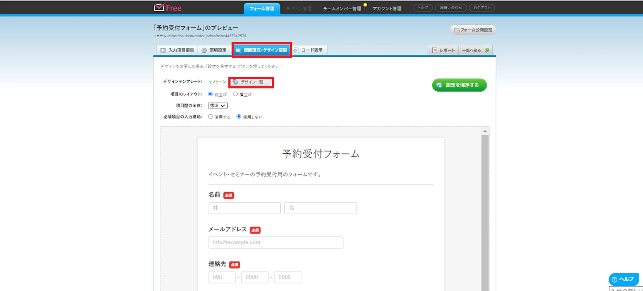 画面確認・デザイン変更タブをクリックすれば、公開されているフォームの画面を確認することができます。