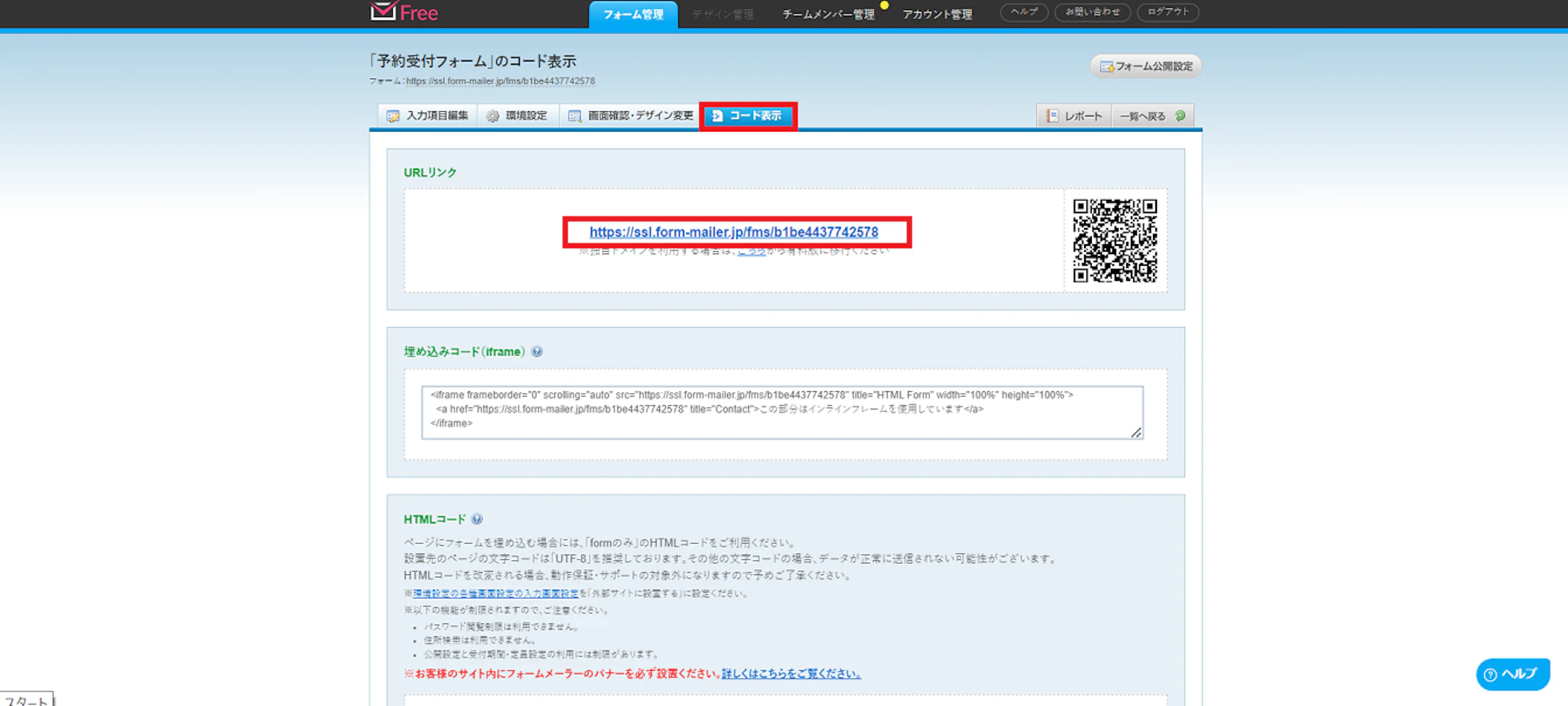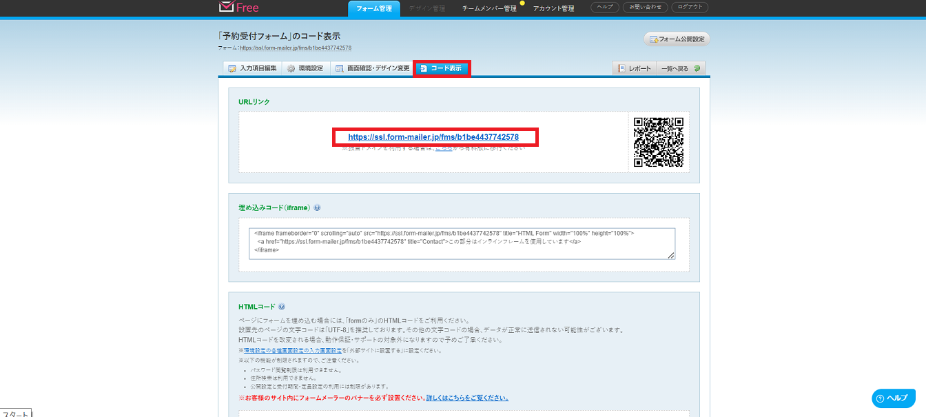 コード表示のタブをクリックすれば、公開されているフォームのURLを確認できます。