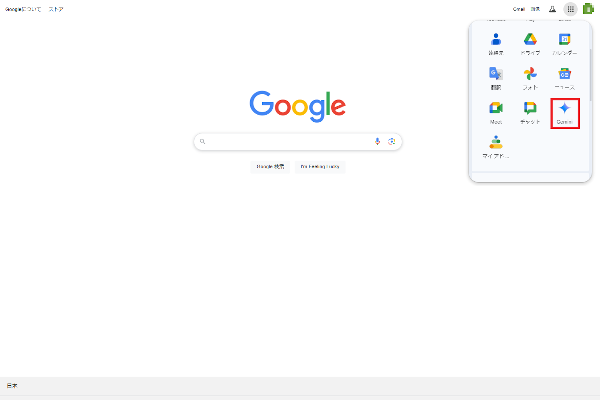 ログインすると右上に9点リーダが表示されます。メニューアイコンの中から「Gemini」を探してクリックしてください。
