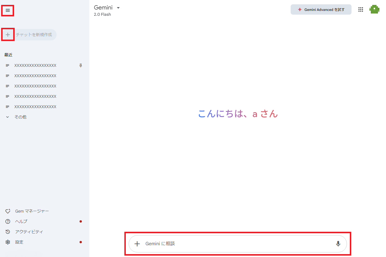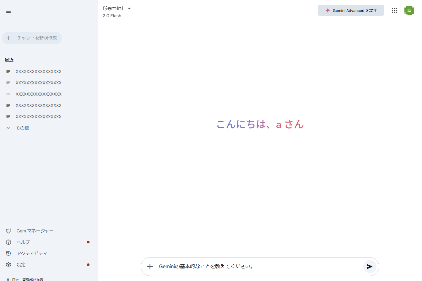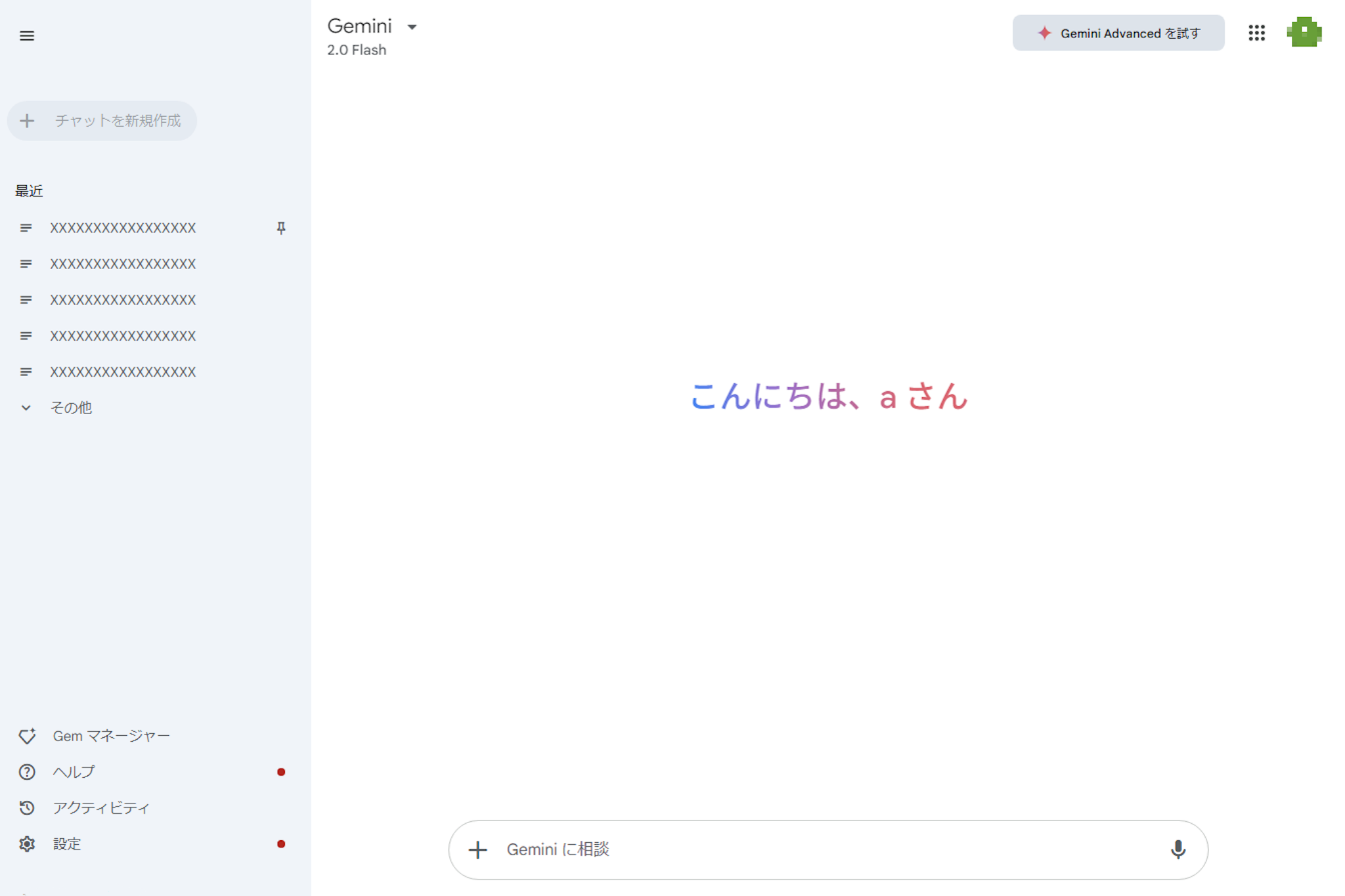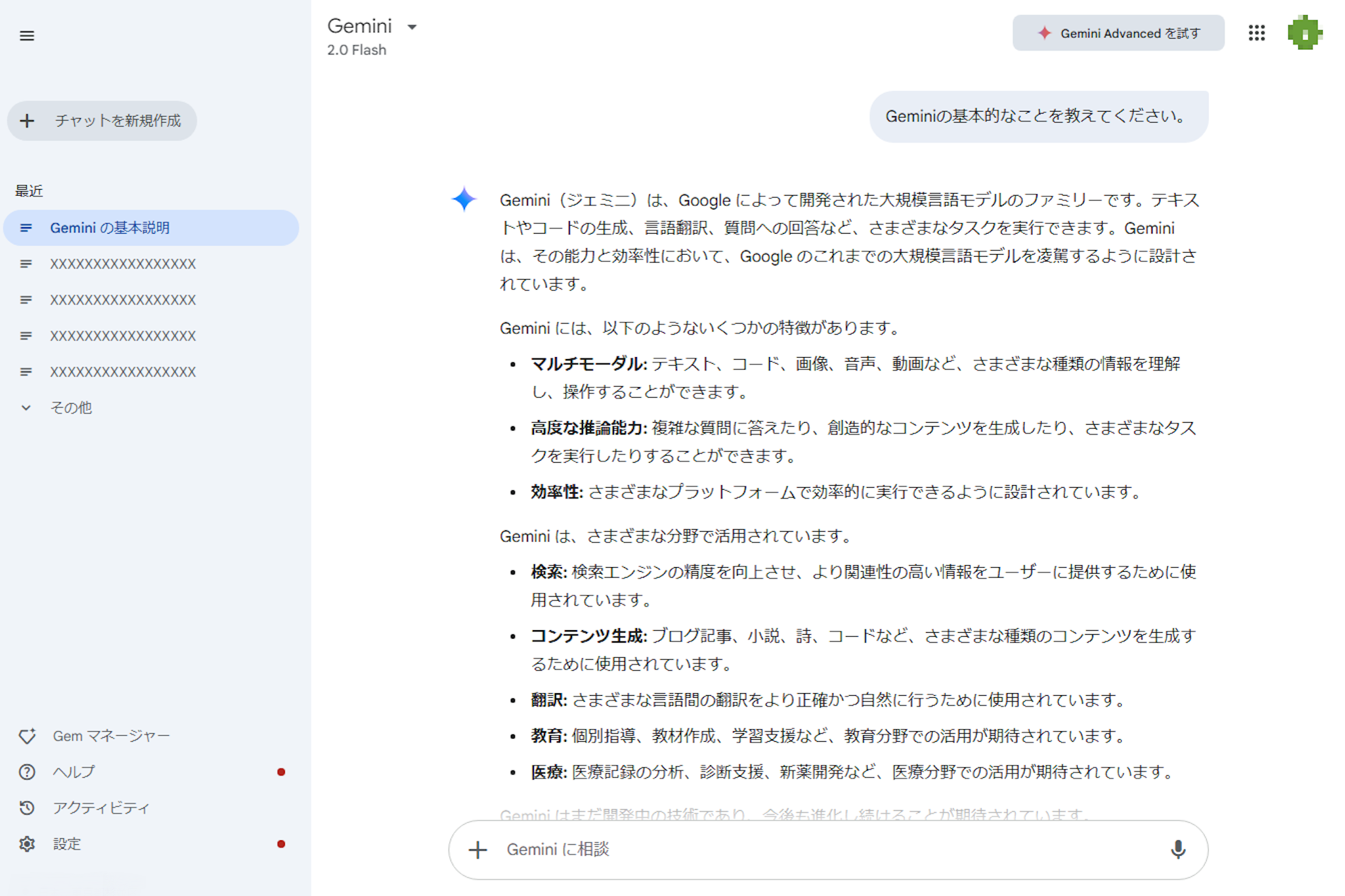 Geminiの入力画面が表示されます。ここから直ぐに始めることができます。