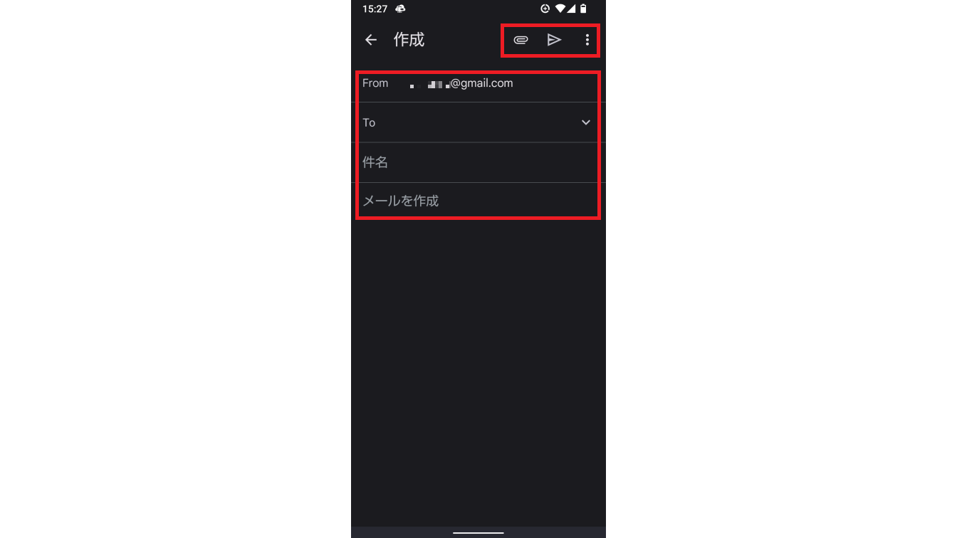 上から送信元「From」宛先「To」タイトル「件名」本文「メールを作成」が並ぶ一般的な入力画面が表示されます。
