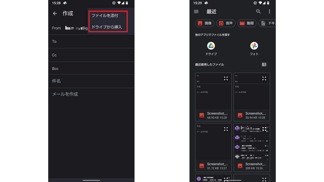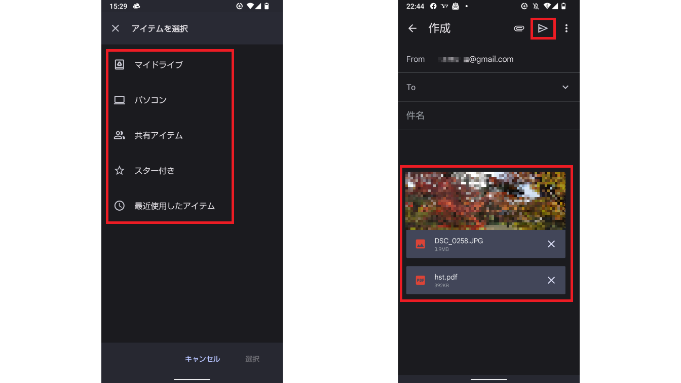 メールにファイルを添付する場合は、「ファイルを添付」でスマホ内のファイルが添付可能です。