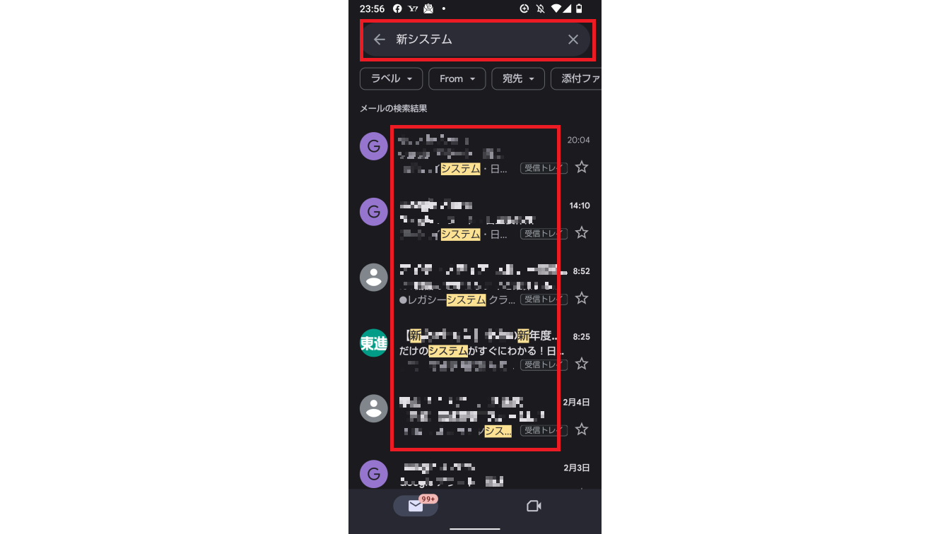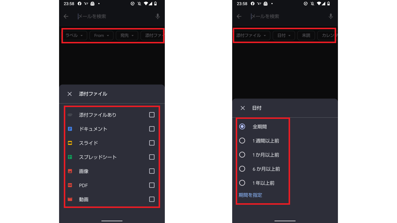 Gmailアプリでは細かな検索が可能です。