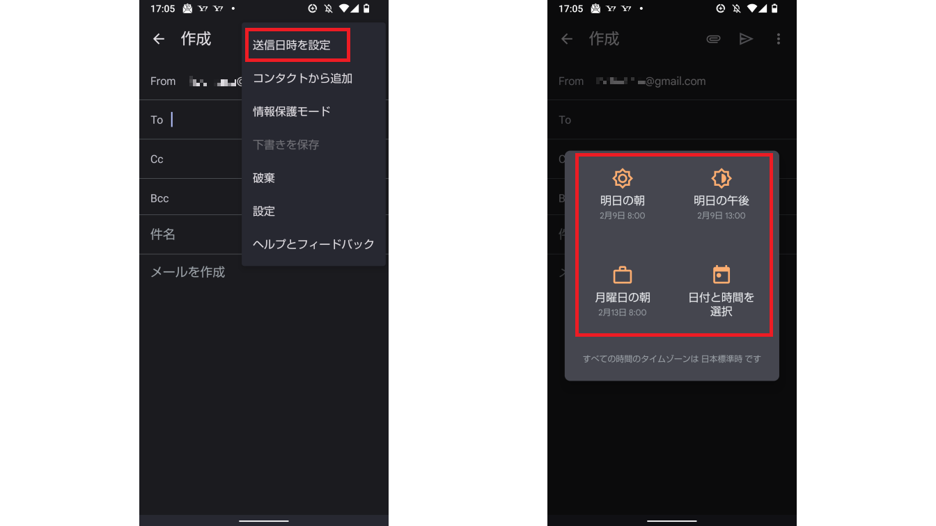 メール作成画面で右上の「︙」を押して、「送信日時の設定」を選択します。