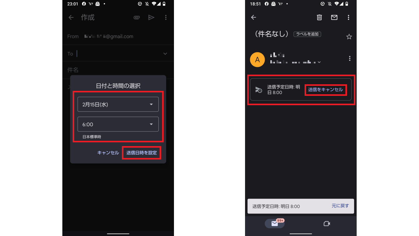 メールには「送信予定」のラベルが設定されます。なお送信を止める場合は「送信をキャンセル」を押せば「下書き」に戻ります。
