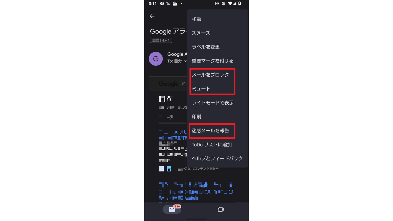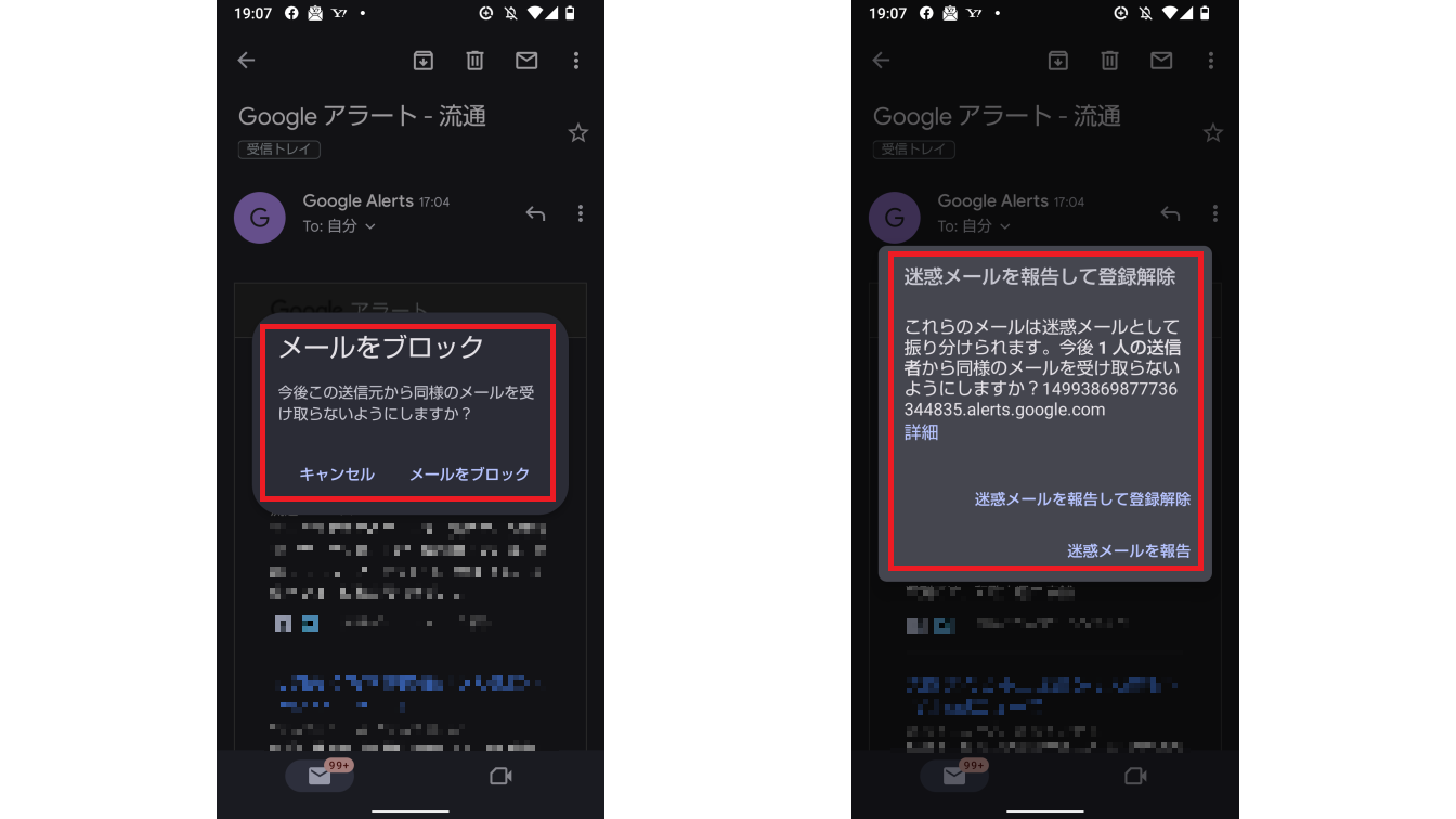 「メールをブロック」は同じ送信元から同様のメールを受け取らないようにします。
