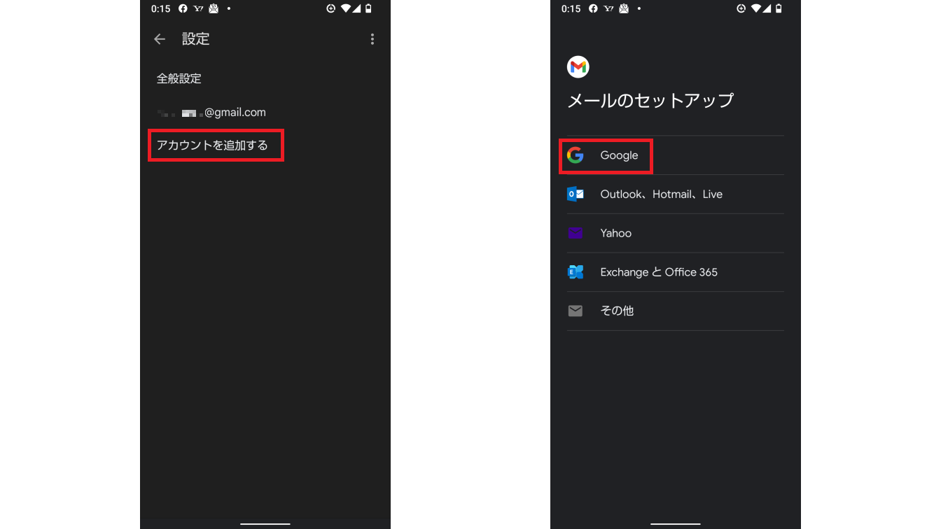 設定画面に移動して「アカウントを追加する」を選択し、「メールのセットアップ」から「Google」を選びます。