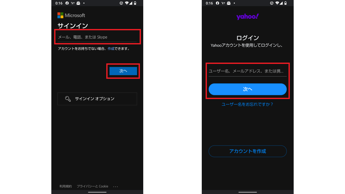 「Yahoo」はYahooメールを利用する場合、「ExchangeとOffice365」はMicrosoftのビジネス向けサービスのメールアカウントを利用する場合に選択します。