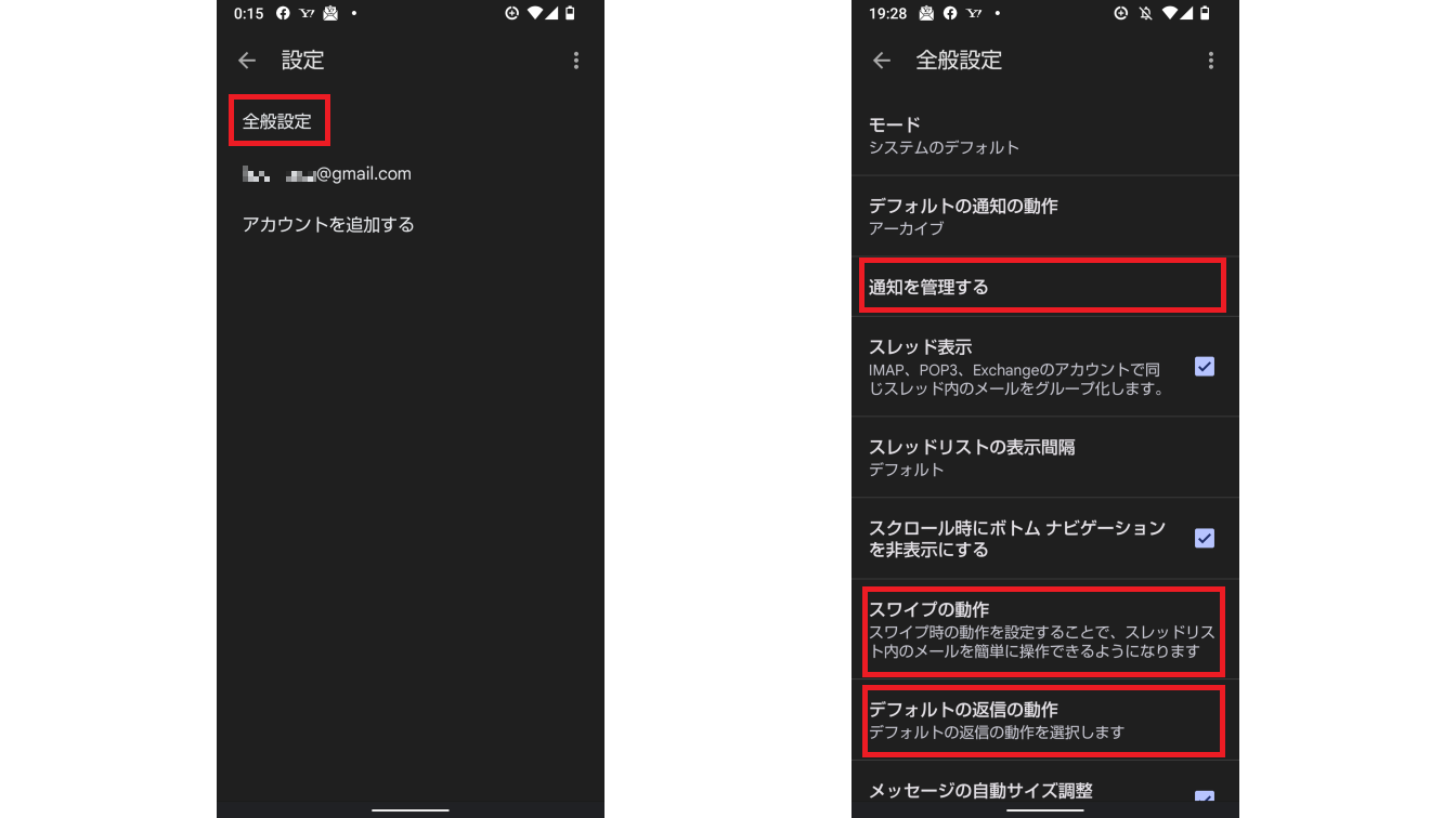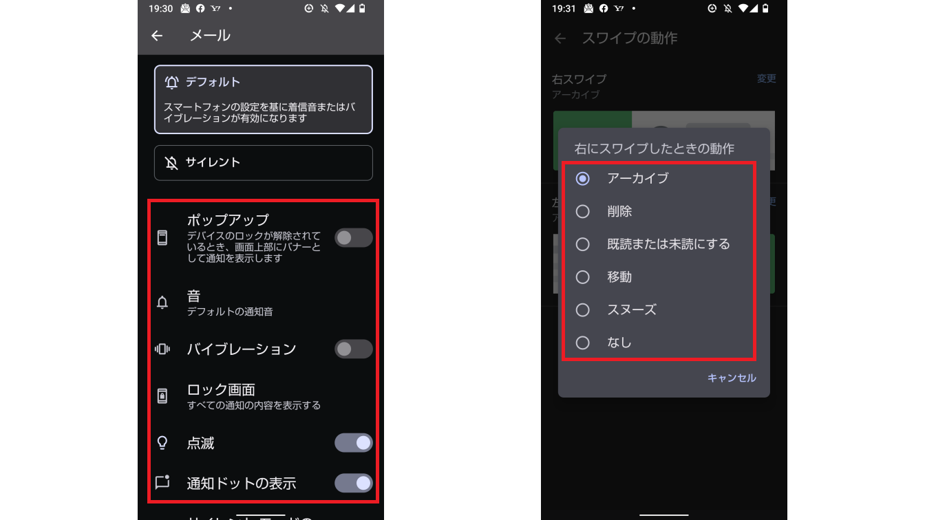 「スワイプの動作」では受信トレイにあるメールをスワイプした時の動作を選択できます。