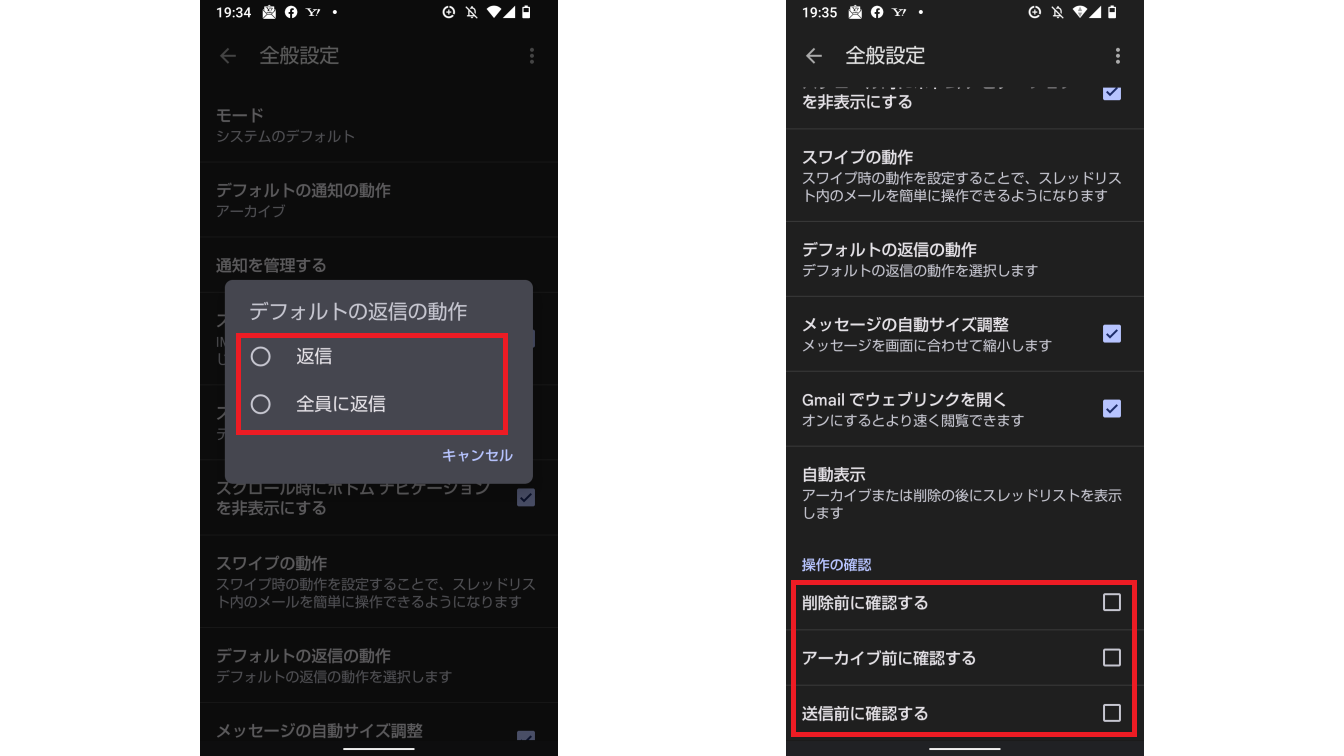 「操作の確認」でチェックボックスを設定すれば、削除前・アーカイブ前・送信前に確認メッセージが表示されるようになります。