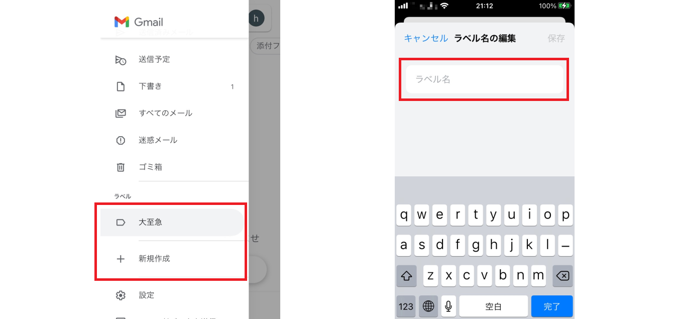 またiOS版は、ラベルの追加がGmailアプリ上で可能です。「新規作成」を選択してラベル名を入力すれば、ラベルが追加されます。