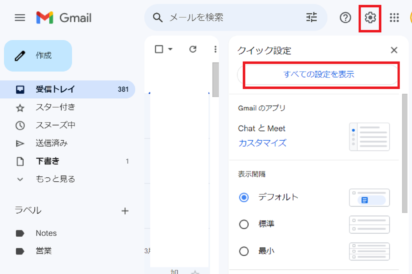 Gmailで右上の歯車アイコンをクリックし、「すべての設定を表示」を選択します。
