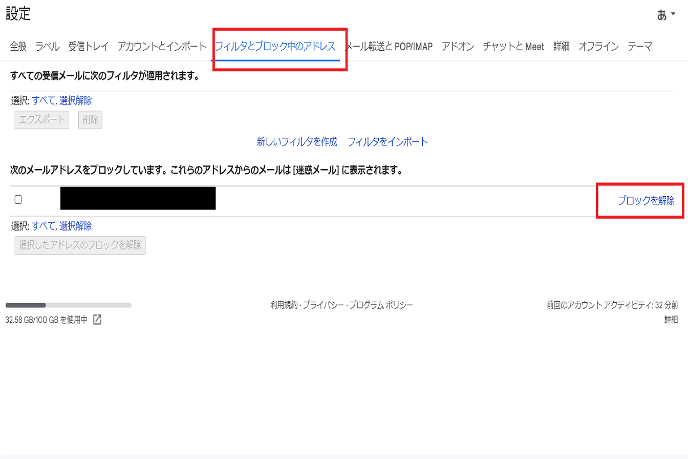 「フィルターとブロックされたアドレス」のセクションで、解除したい送信者の横にある「ブロック解除」をクリックします。
