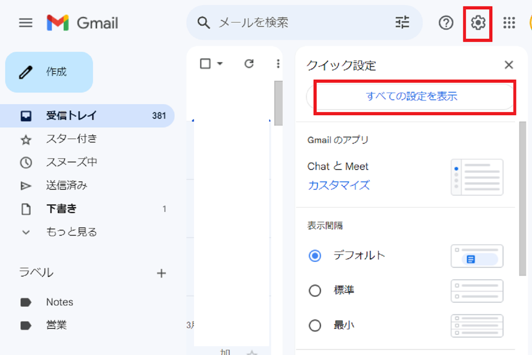 Gmailを開き、右上の歯車アイコンをクリックして「すべての設定を表示」を選択します。