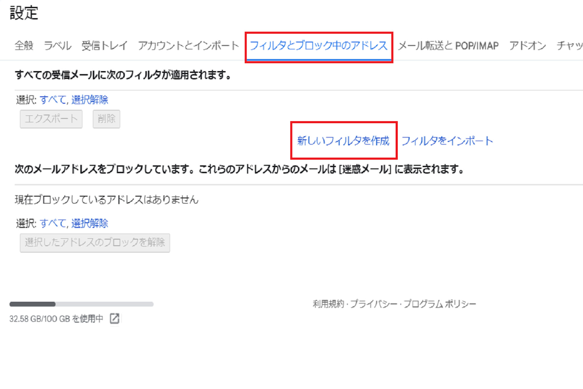 上部のタブから「フィルターとブロックされたアドレス」を選択し、「新しいフィルタを作成」をクリック。