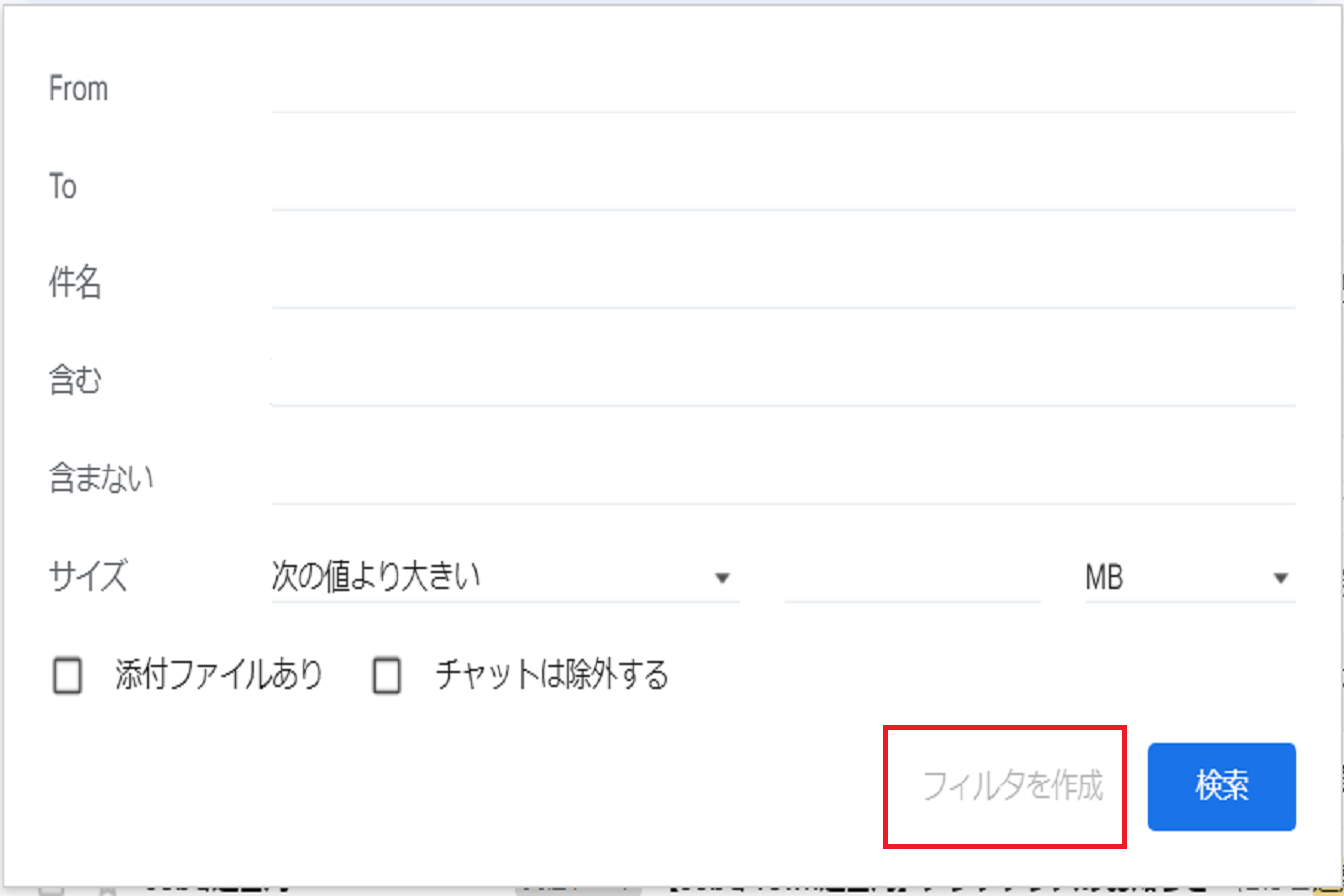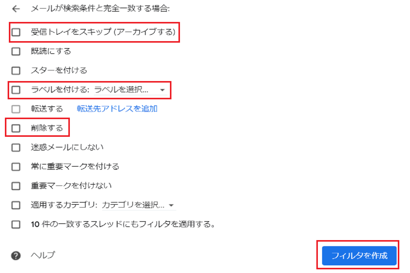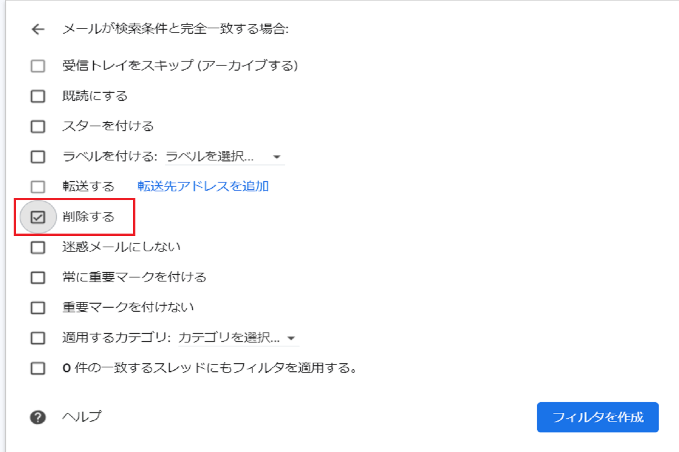 「フィルタを作成」をクリックし、次に表示されるアクション選択で「削除する」、「ラベルを付ける」、「受信トレイをスキップする」などのアクションを選び、「フィルタを作成」をクリックします。