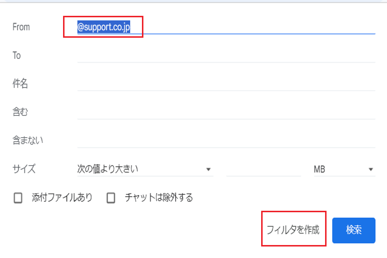 例えば、abc@support.co.jpなどの不要と思われるドメインからのメールを一括でブロックしたい場合、フィルタリング「From」セクションで「@support.co.jp」と設定し、「削除する」アクションを選択します。
