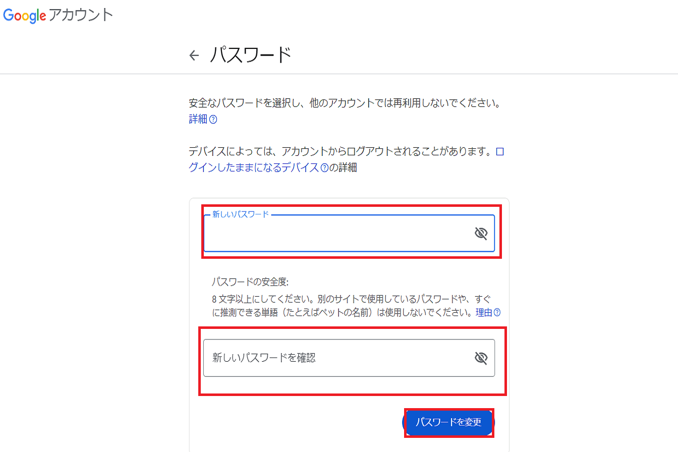 次に、パスワード変更画面にて、新しいパスワードと、確認のため指定された2か所に同じ新しいパスワードを再入力し、「パスワードを変更」ボタンをクリックし完了です。