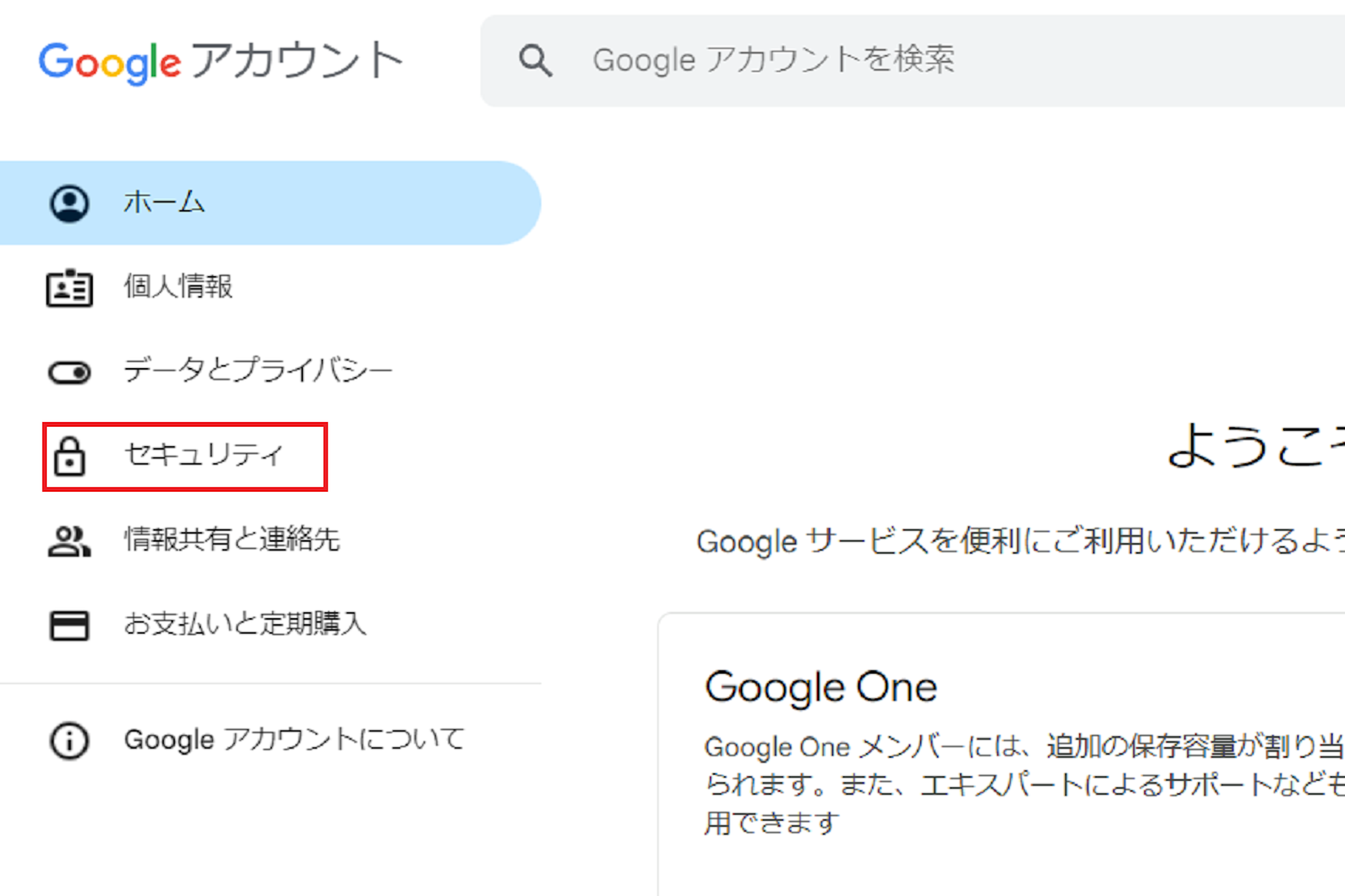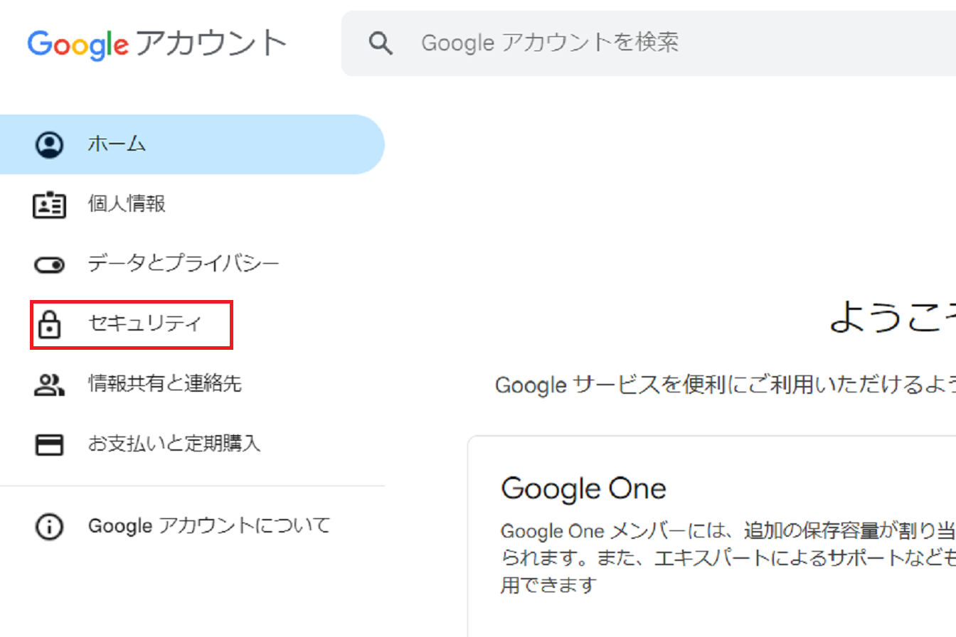 Googleアカウントにログインし、「セキュリティ」タブを選択します。